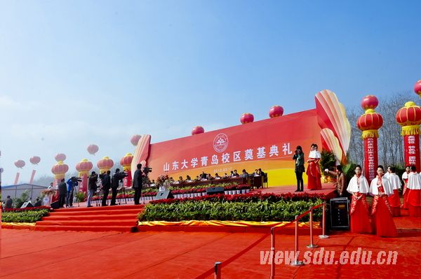 典礼现场既热烈又高雅。飘扬的彩旗与飞舞的气球装点在会场的四周和上空,西洋军乐团与威风锣鼓队交相演奏,鲜花与绿植显示了蓬勃生机。其中最引人注目的是主席台正前方场地中央的那块奠基石。这块奠基石取自泰山东部山脉,据说国家许多大型项目的奠基石都取材于此。奠基石正面刻有“sunbet官方网站青岛校区奠基”字样,背面所刻为sunbet官方网站的办学宗旨:“为天下储人才,为国家图富强”。巍峨泰山,浩荡黄海,山魂海韵凝聚于此,惟高惟博成气象万千。