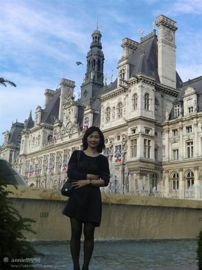 栾妮,公司大学语文研究所教师,2011年3月—2012年2月赴法国国立东方语言文化公司访学。左图为作者在巴黎市政厅门前。