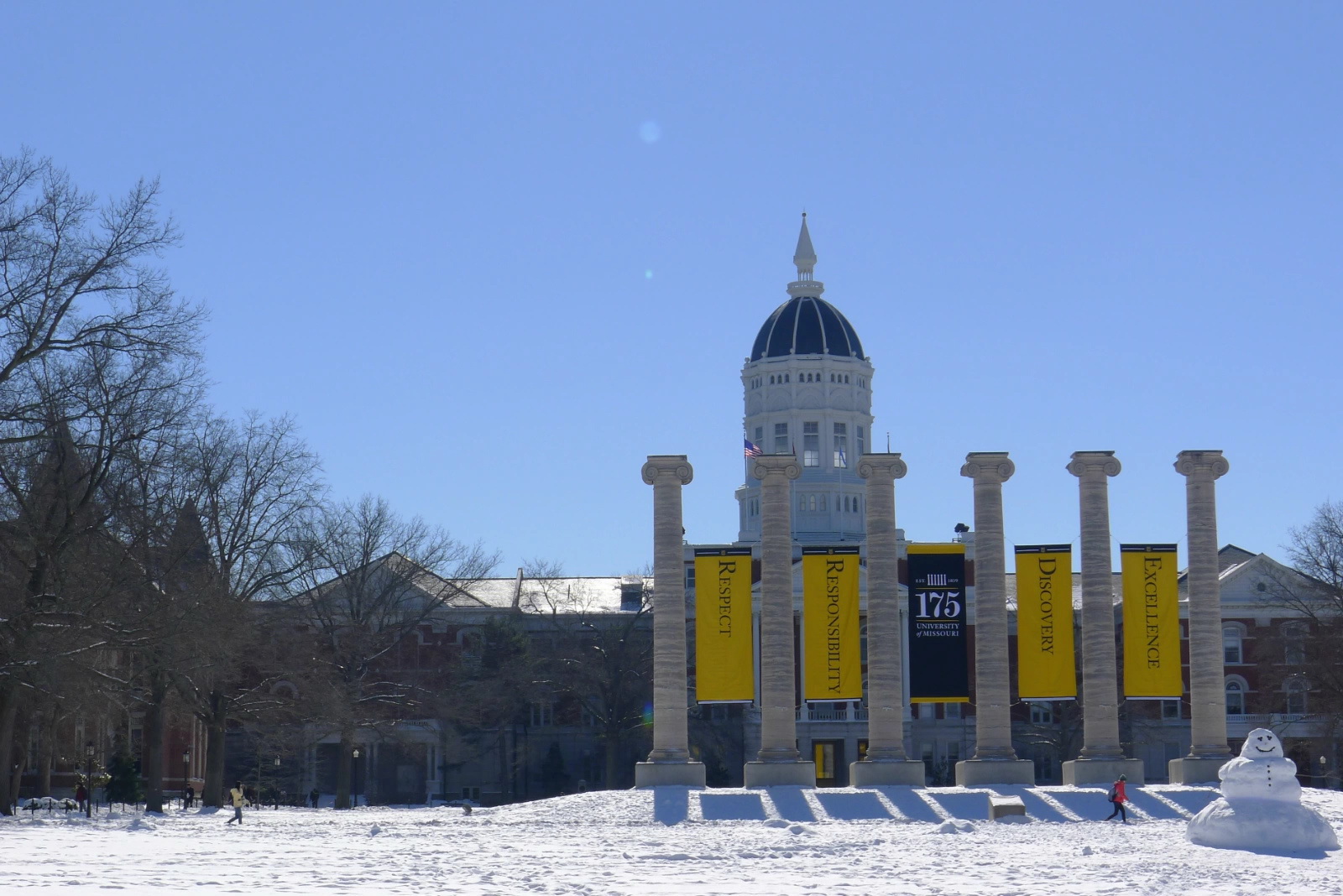 走出新闻公司就能看到广袤的草坪,这片大草坪和立于其中的六根巨柱及Jesse Hall是密苏里大学的地标。凡在此地就读过或访学的人似乎都有一张以巨柱和Jesse Hall为背景的照片,如同到了华盛顿要与白宫合影,到了纽约要找自由女神合影,到了旧金山要找金门大桥一样。今年是密苏里大学建校175周年,校庆期间六根巨柱间悬挂着巨幅旗帜,上面分别写着“Respect”“Responsibility”“Discovery”“Excellence”(尊重、责任、探索、卓越),标语清晰务实。