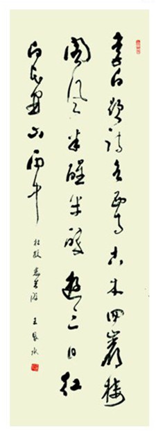 我还临过张旭和怀素的草书,他们均重在感情的宣泄。张旭把内心的喜怒哀乐以狂草书之,张旭用笔提按分明,中锋侧锋并施,粗细对比悬殊,笔势雄豪纵逸。杜甫《饮中八仙歌》云:“张旭三杯草圣传,脱帽露顶王公前,挥毫落纸如云烟。”我临张旭的草书,学得了行笔的粗细变化,天马行空的气势。但从先生平时的言语,也许是我的误解,好像是学习怀素倒比草圣张旭更重要。他以篆入草,闯出自家风格。我临过《小草千字文》、《大草千字文》、《自叙帖》等。老师说《小草千字文》达到极致程度,《自叙帖》是怀素成熟时期的作品,洋洋巨篇,一气呵成。我也临过黄庭坚的大草《太白忆旧游诗》、《诸上座》。先生认为,“黄庭坚是把用笔的提按入草,使狂草的一点一划更有一波三折,使线条更为丰富。”他的狂草纵横奇崛,以侧险取势,不计较点画是否合乎法度,而重视的是点画所表达的感情。