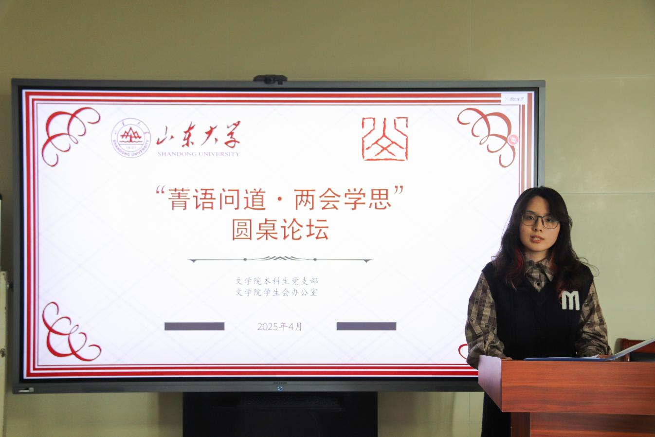 会议伊始,李怡彤简要介绍了本次论坛的举办背景与讨论目标。她阐述了本次论坛的研讨主题,说明讨论内容聚焦两会精神、关注时代热点,并涵盖思政教育、文化传承、文学创作和中外交流等多个重要领域。她表示,各位同学应以此次论坛为契机,学思践悟两会精神,坚定理想信念、勇于担当作为、砥砺奋进向前,为实现中华民族伟大复兴的中国梦持续奋斗。