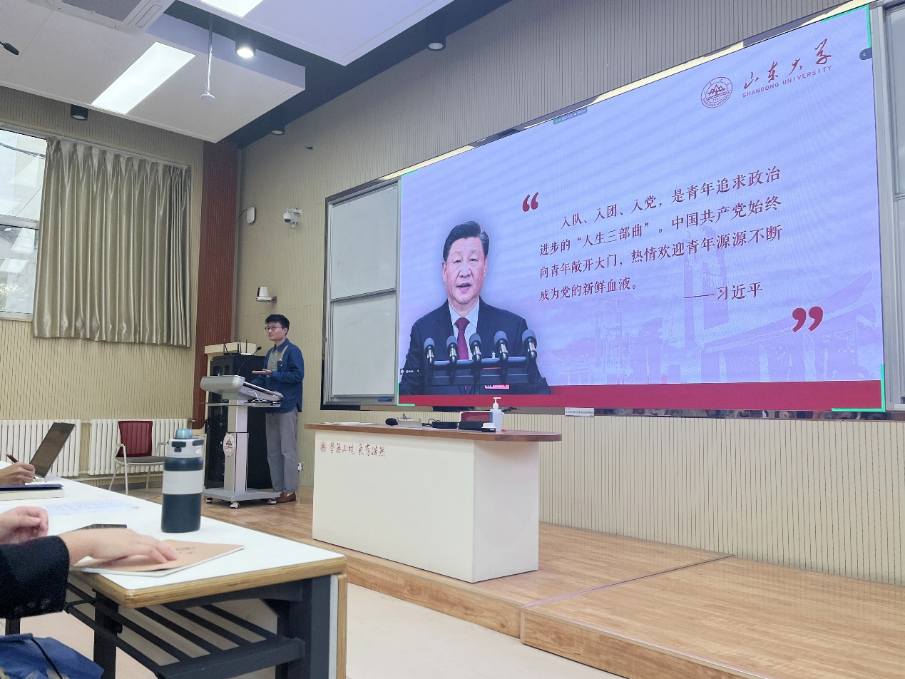 随后,刘牧晨对于新生们的发言进行总结,通过对入党誓词进行解读来讲述共产党人需要具备的素养与党组织的基本特征。他立足马克思主义建党学说和中国共产党发展壮大的百年辉煌历程,揭示党的性质宗旨、初心使命。党没有任何自己特殊的利益,在任何时候都把群众利益放在第一位,同人民休戚与共、生死相依。刘牧晨鼓励新生们不断发展和完善自身,在未来的学习生活中以更加积极的态度向党组织靠拢。