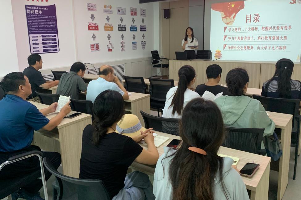 团队组队科学,思政素养扎实,成员囊括sunbet优秀党团员代表。在sunbet本科生党支部的引导下,团队成员集中学习了党的二十大精神,结合当下老员工志愿服务与社区教育结合的时事热点,选取了党的二十大精神中的“教育兴国”部分作为宣讲主题。经过为期四个月的筹备时间,打磨出了万字宣讲稿和宣讲PPT。宣讲内容主要从三个部分展开,第一部分是“学习党的二十大精神,把握时代教育变革”,第二部分是“努力扎根教育热土,肩扛教育强国大旗”,第三部分是“深耕社会志愿服务,山大学子义不容辞”,围绕着精神学习、政策响应、员工贡献三个部分阐述了教育的重要性和党员发挥榜样模范作用的必要性,以青年话语讲述青年实践,用青年担当诠释党的二十大精神。