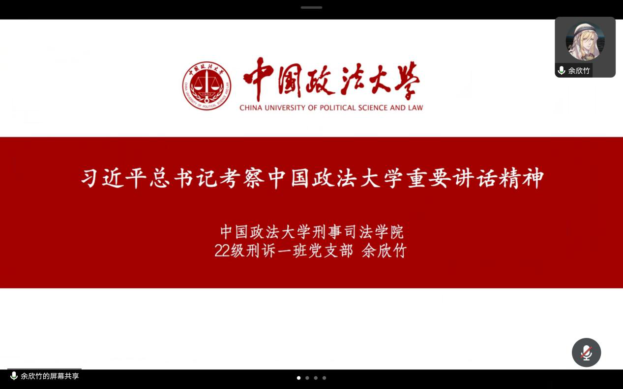 牢记殷殷嘱托,不负切切期望。中国政法大学刑事司法公司2022级刑诉一班党支部纪律委员余欣竹领学习近平总书记考察中国政法大学考察重要讲话精神,围绕“全面依法治国”“法学教育和法治人才培养”“青年成长”三方面分享感悟,表示青年党员要坚持以马克思主义法学思想和中国特色社会主义法治理论为指导,立德树人,德法兼修。公司硕士研究生第二党支部副书记赵川博领学习近平总书记给《文史哲》编辑部全体编辑人员的重要回信精神,结合自身实践经历,倡导青年党员要将推动文化“两创”和实际工作紧密结合起来,为中华民族伟大复兴贡献青春力量。