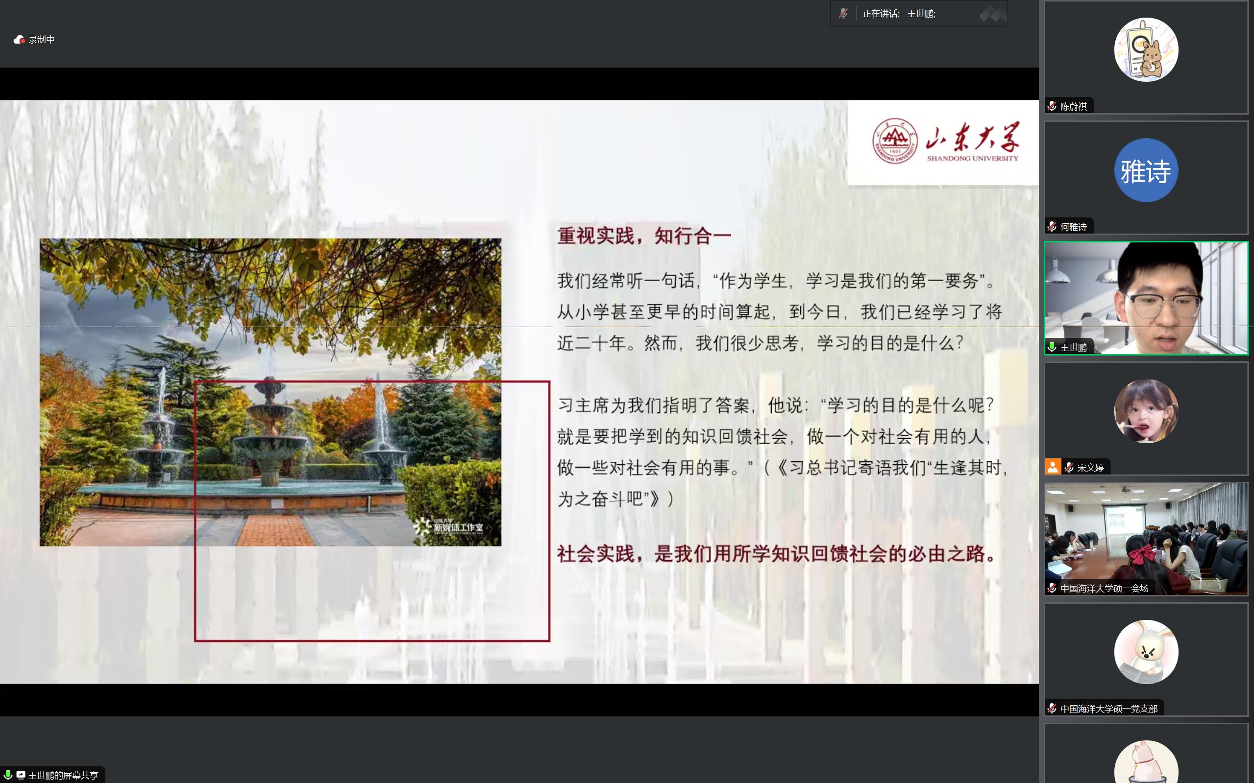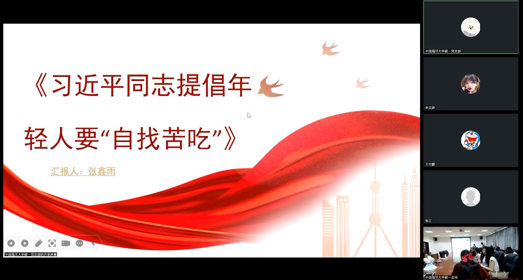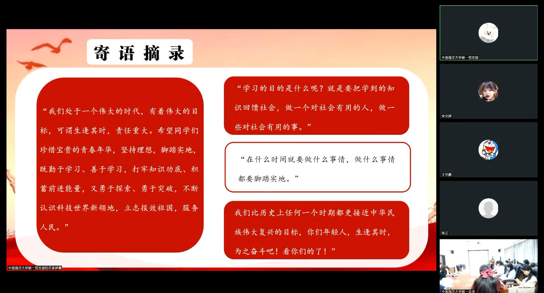其后,中国海洋大学文学与新闻传播公司硕士研究生第一党支部党员张鑫雨以“习近平同志提倡年轻人要‘自找苦吃’”为主题进行分享,围绕“立志要高,起步要低”“从实践中汲取真知”“积少成多,循序渐进”“多学多干,百炼成钢”四个方面说明了实践的具体方法。常文慧分享了自己阅读《习近平与老员工朋友们 (十四) 》的学习感悟,倡议同志们抓紧大学这一学习的黄金时期学习知识、打好基础,并做到“读万卷书,行万里路”。王雪领学了习近平总书记对青年人的寄语,认为作为青年一代的我们应该坚定信念、勇敢拼搏,在千载难逢的时代中勇立潮头,奋发书写我们这一代人的辉煌答卷。王雪晶分享了自己对“扣好人生的第一粒扣子”等寄语的学习札记,认为这些寄语蕴含着丰富的人生哲理,充满了习近平总书记对青年一代的热切关怀和殷切期望。