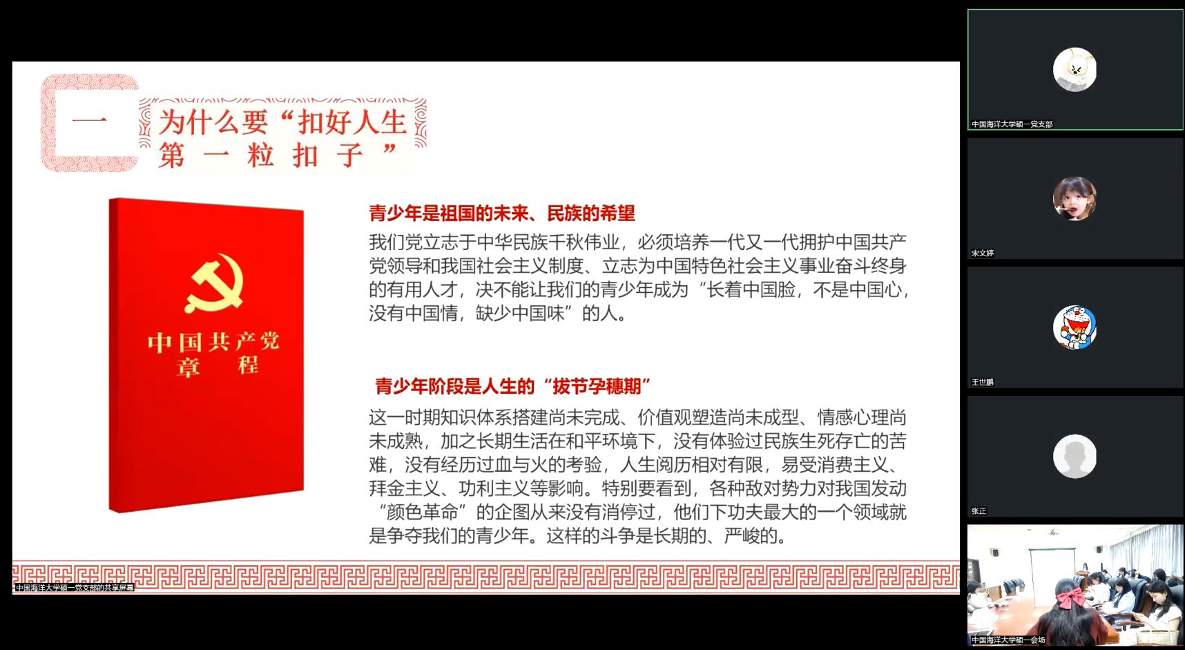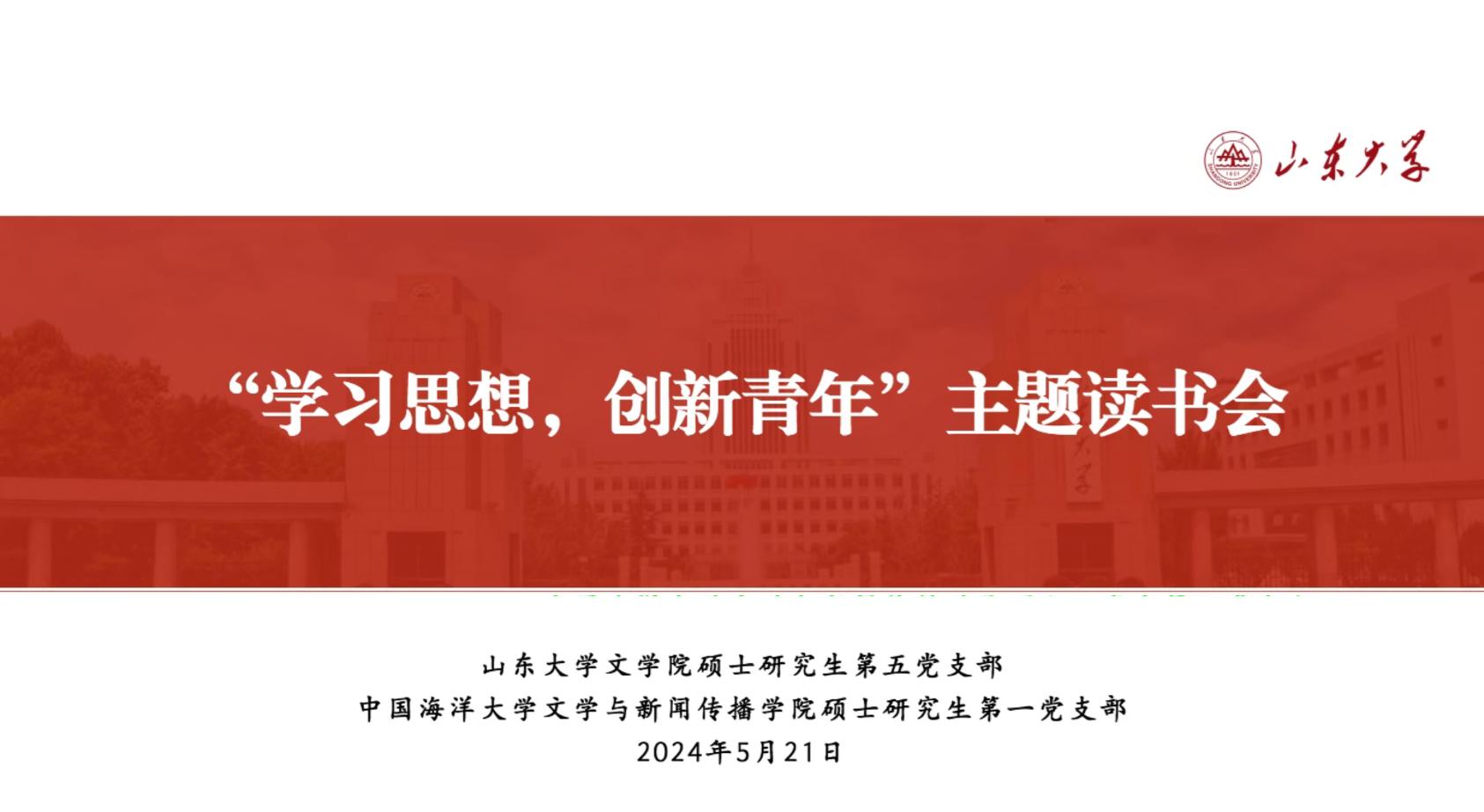 青春向党,青年向上。为深入学习宣传贯彻2024年5月4日习近平总书记在五四青年节对全国广大青年寄语精神,和习近平总书记在二十届中央纪委三次全会上发表的重要讲话精神,启发青年党员在奋进新征程的道路上既有勇往直前的勇气,更有守住底线的智慧,5月21日下午,sunbet硕士研究生第五党支部联合中国海洋大学文学与新闻传播公司硕士研究生第一党支部,共同举办了2024年春季学期第三期“学习思想,创新青年”读书会。