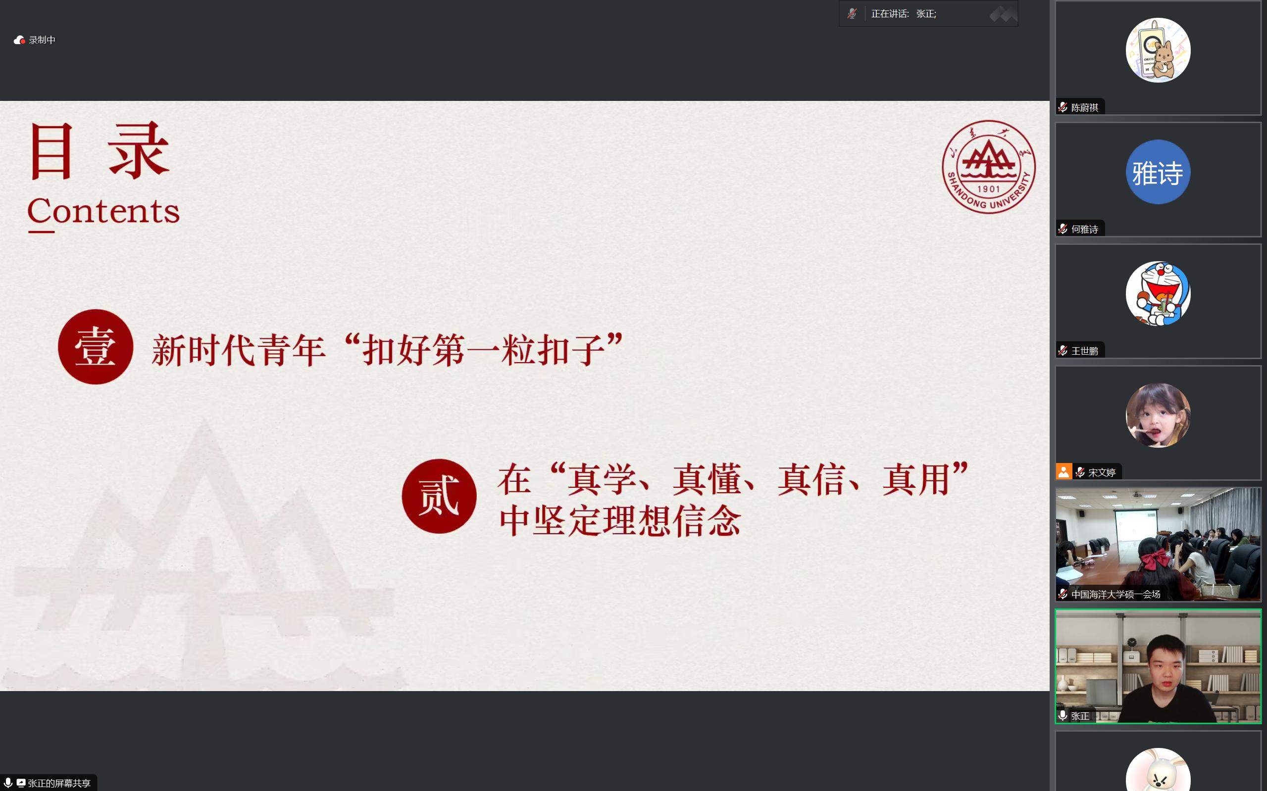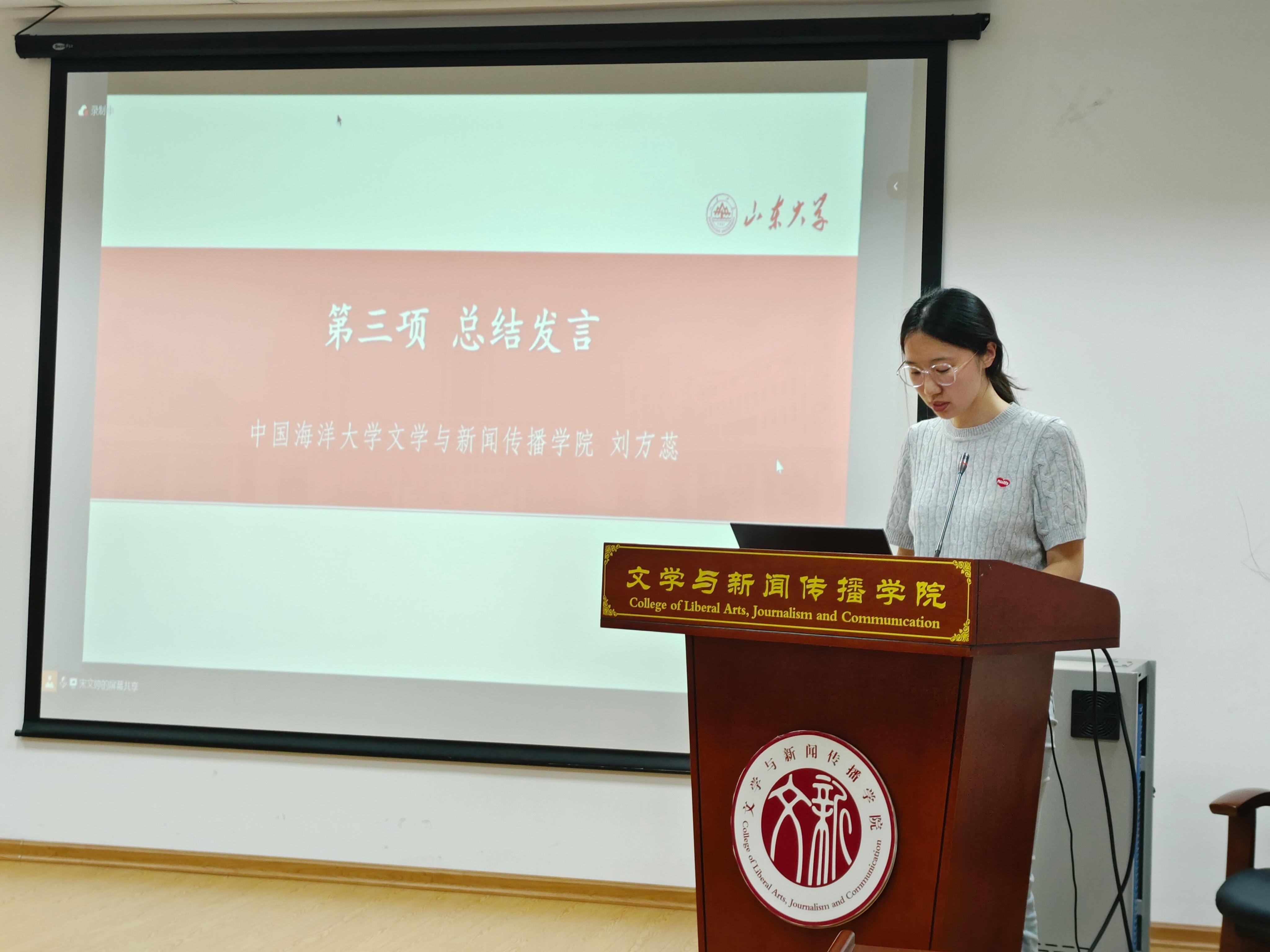 最后,会议进入第三项议程,中国海洋大学文学与新闻传播公司硕士研究生第一党支部书记刘方蕊作总结发言。刘方蕊总结道,本次两校同学阅读的《习近平与老员工朋友们》这本书是深入学习习近平总书记关于青年工作的重要思想的鲜活读本,结合《中国共产党纪律处分条例》进行联合共学,对做好新时代青年工作、助力当代青年健康成长具有重要的示范意义。希望同志们坚定理想信念、厚植人民情怀、矢志艰苦奋斗、锤炼品德,加强道德修养,明辨是非,做有时代担当的青年人。