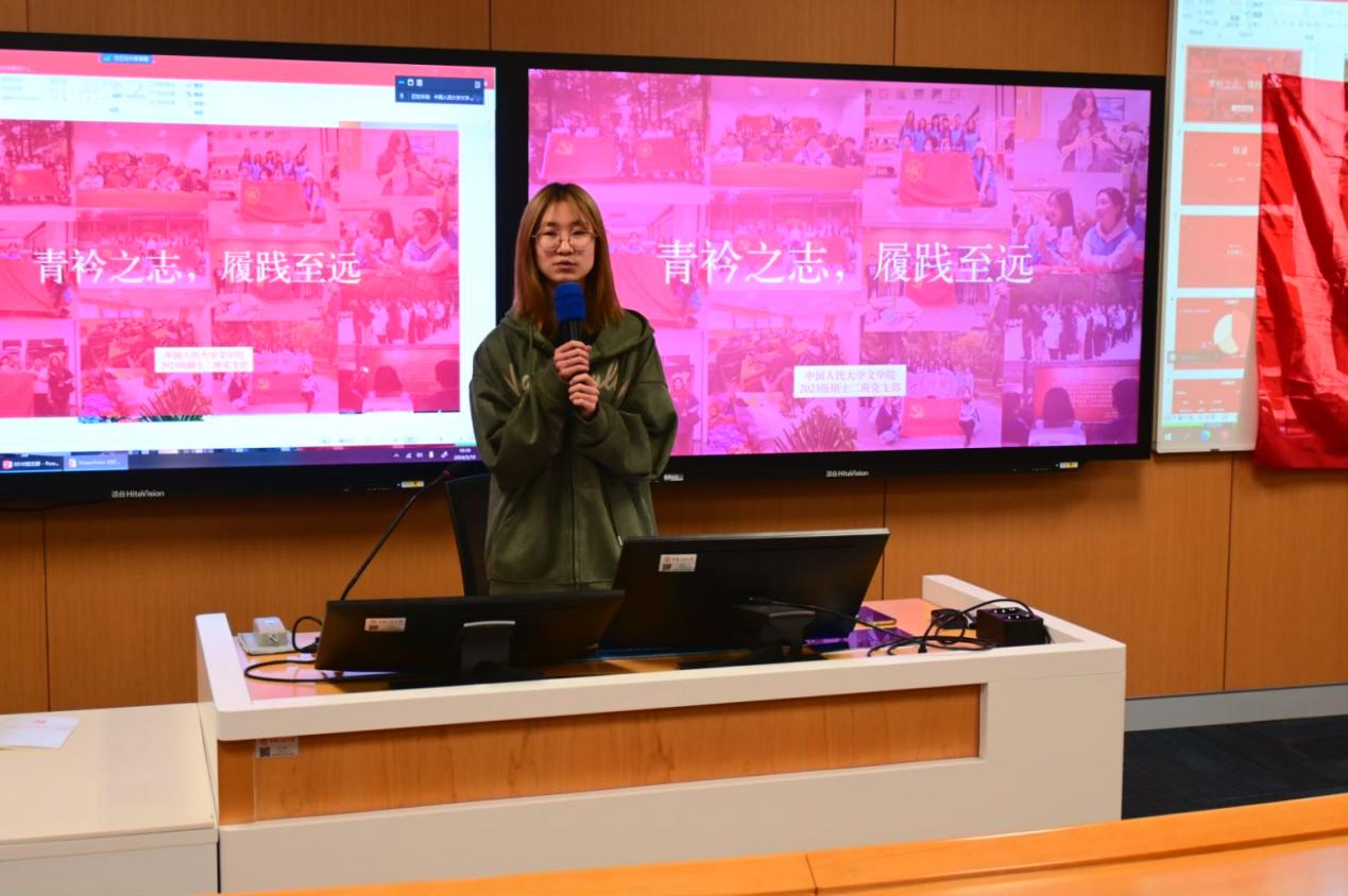 会议伊始,公司硕士研究生第六党支部书记李方政作读书会主题和议程介绍,并立足建设“学习型党支部”、“先锋型党支部”、“港湾型党支部”的角度分享支部建设思路和支部工作概况。随后,中国人民大学sunbet2023级硕士二班党支部书记任君敏作主题引入,以“青衿之志,履践至远”为主题,从支部概况、工作内容、工作理念三个方面介绍了本支部。两支部也结合支部工作开展情况,从党支部建设和青年发展角度开展了探讨交流。
