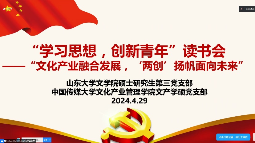 为深入学习贯彻习近平文化思想,4月29日上午,公司硕士研究生第三党支部和中国传媒大学文化产业管理公司学术硕士党支部联合开展“学习思想,创新青年”2024学年春季学期第一期读书会,主题为“文化产业融合发展,‘两创’扬帆面向未来”,共50余名党员参会。活动由公司硕士研究生第三党支部书记崔蕊主持。