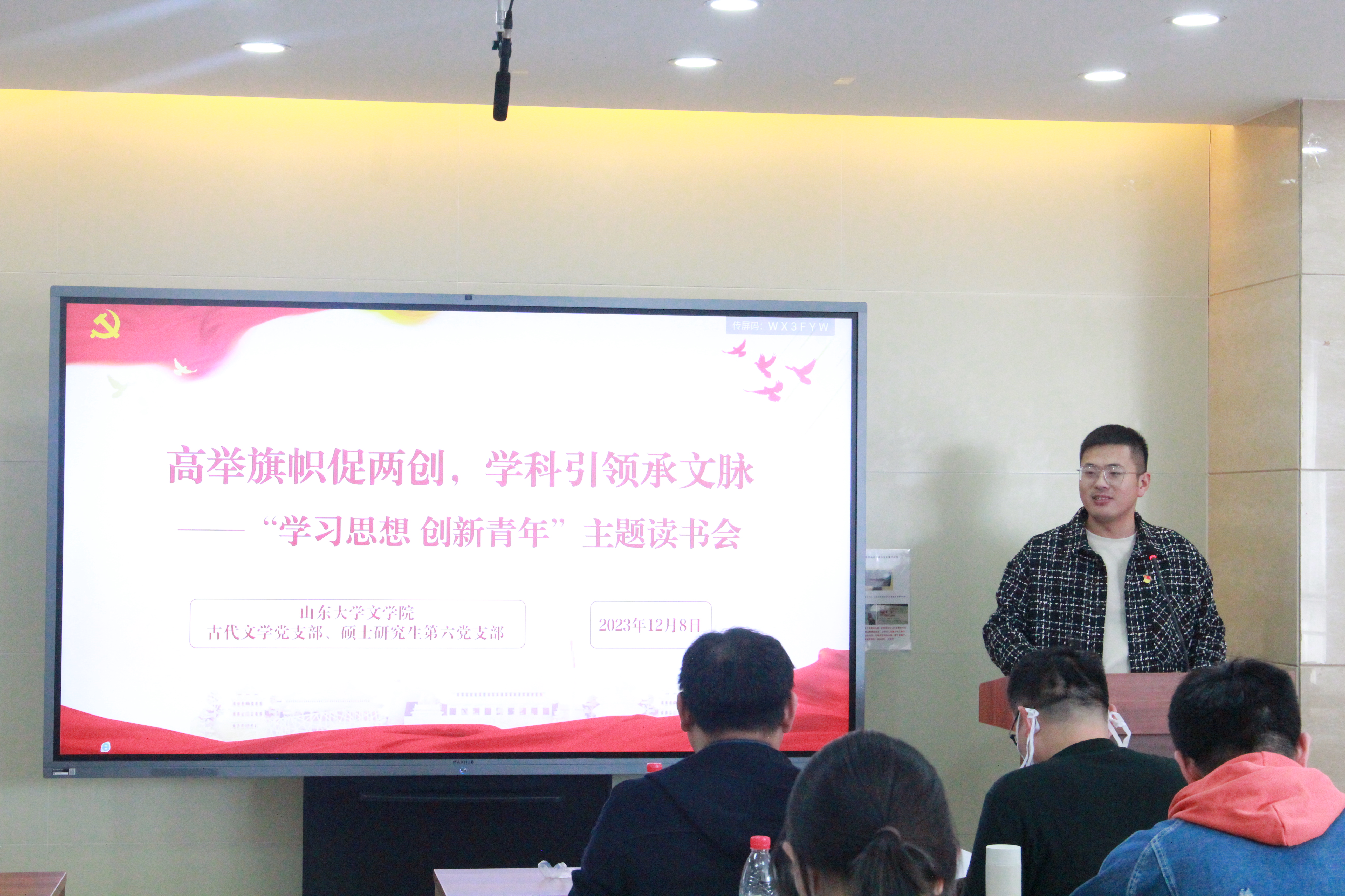 高举旗帜促两创,学科引领承文脉。为深入学习贯彻习近平文化思想,厚植政治理论学习成色,更好担负起新时代中文人的文化使命,12月8日下午,公司古代文学党支部和硕士第六党支部在知新楼A606联合举办了“学习思想,创新青年”2023年秋季学期第五期读书会。