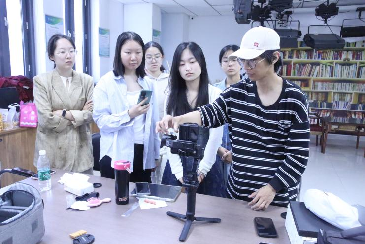 完成理论讲解后,韦宇伦指导成员进行设备实操。他演示了稳定器的安装调试流程,并引导成员完成相机重心校准等关键操作。此外,他分享了常用的运镜技巧,提醒成员们运镜增强静态画面的表现力,并带领与会人员练习推、拉、移等运镜手法。讲解结束后,参训成员在韦宇伦的指导下分组进行实操演练,在模拟拍摄的过程中深化对所学技巧的理解,韦宇伦点评小组作品并提供改进意见。