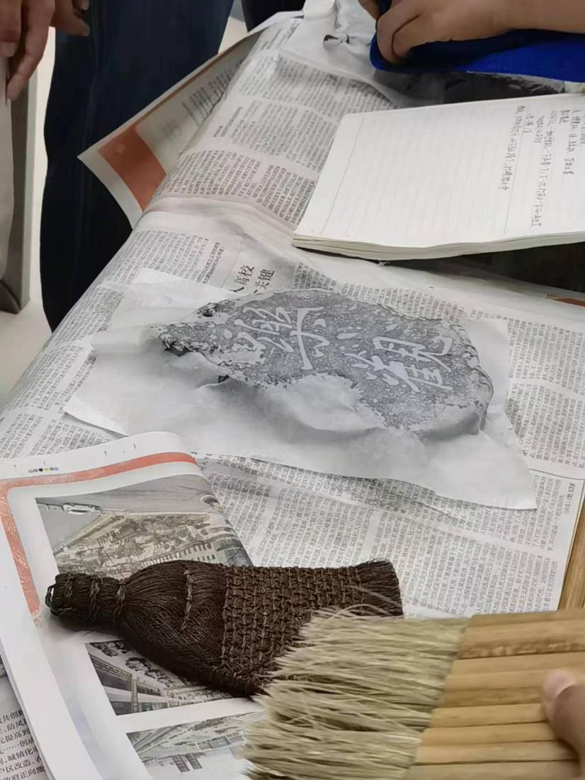 随后,姚老师鼓励同学们亲自动手尝试,珍惜这次难得的学习机会。在老师们的指导下,同学们纷纷结成小组,开始尝试自己动手拓印。大家按照老师讲授的石碑拓印基本步骤,积极动手操作,在实践中触摸历史的心跳,感受传统文化的独特魅力。实践过程中,课堂气氛热烈非凡,同学们不仅锻炼了动手能力,还增强了团队合作意识。