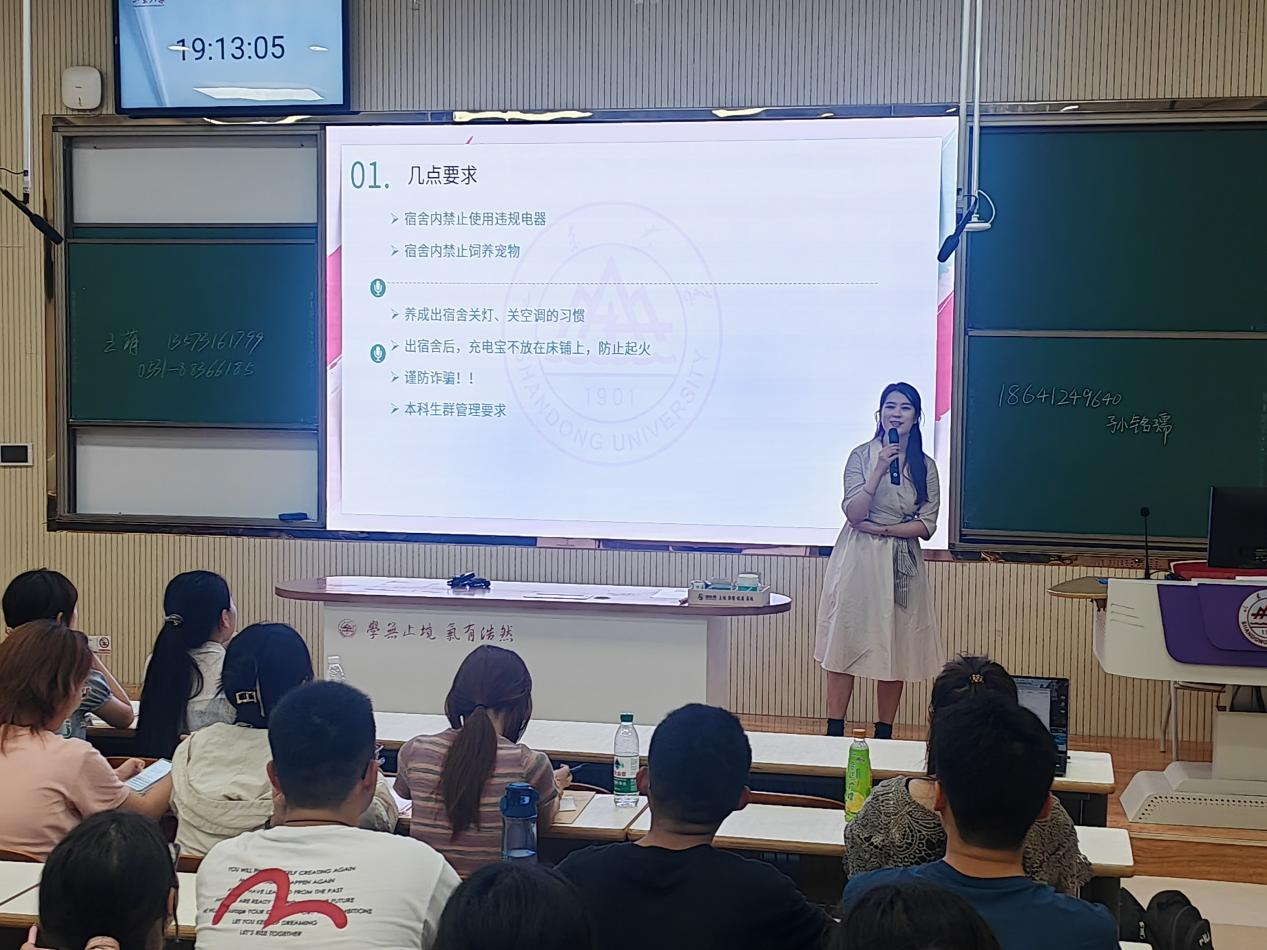 会议伊始,孙铭孺再次向全体新生的到来表示热烈的欢迎,也祝愿新生同学可以在sunbet度过愉快而有意义的大学四年。在简单的自我介绍后,她向新生提出了一些切实的要求,包括宿舍内电器的规范使用,及时关闭电器的节能习惯,宿舍内的隐患排查等等。另外,孙铭孺着重强调了防诈骗意识和规则意识,希望员工可以严守个人隐私,警惕电信诈骗,并在大学新环境中严格遵守校规校纪,用更高的标准严格要求自己。