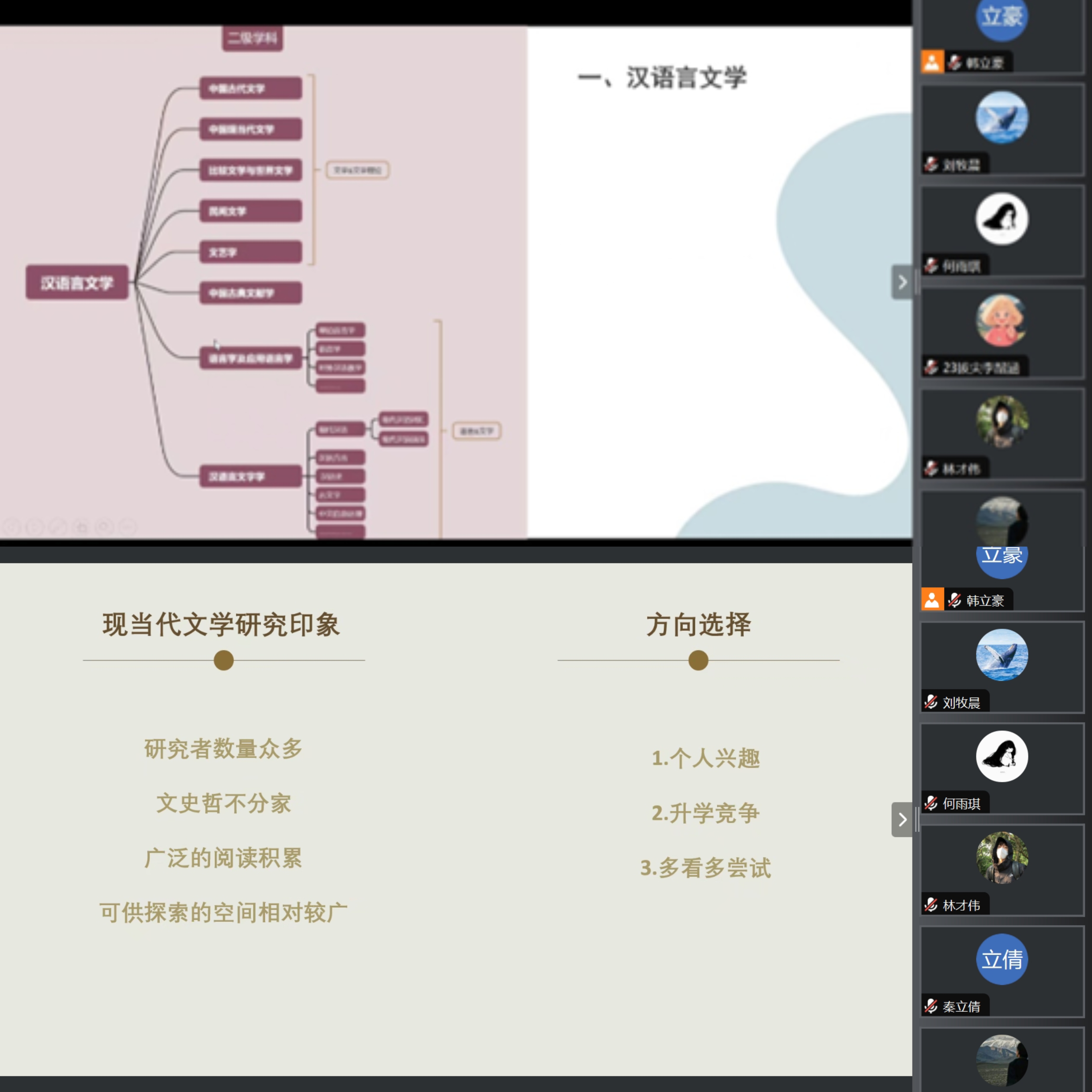 2021级本科生徐荣先从“什么是文艺学”“文艺学的特征”和“小方向选择原则”三方面详细介绍文艺学专业及论文撰写要求;2024级硕士生林才伟结合自己发表的学术成果,系统讲解中国古典文献学的研究内容与方法;2024级硕士生秦立倩梳理了“原典导读课-自主阅读文献-培养兴趣-论文选题”各阶段要求,对汉语言文字学的学习和研究予以辅导;2024级硕士生刘牧晨以“回向传统的中国古代文学研究”为题,从同学们刚学习过的文学史出发,分享精读文学原典、上溯原始文献的研究路径;2024级硕士生王韵茗立足自身对现当代文学的研究经验为同学们讲述论文选题的原则和方法,并推荐相关公众号及期刊读物;2021级本科生邓子铭对民间文学这一新兴学科进行了富有趣味的介绍,并带来了拓宽学科交叉视野、撰写高质量论文的方法论指导。