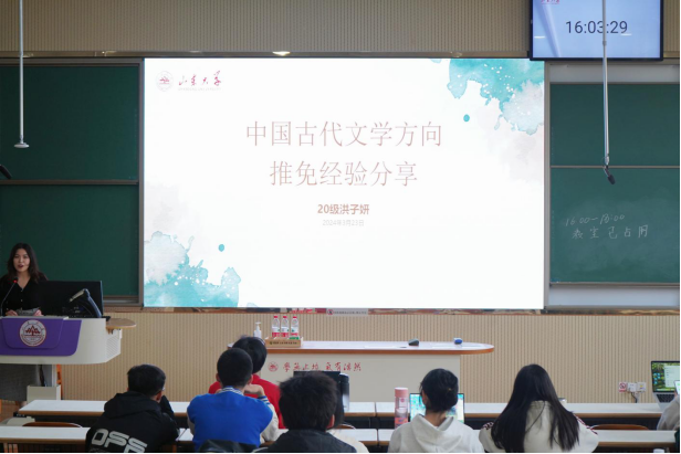 活动伊始,洪子妍就个人情况、推免准备和推免测试三个方面介绍了中国古代文学方向的保研经验。她从个人经历出发,着重强调了学业的重要性,鼓励同学们积极参与科研项目、充分培养问题意识、精心写作高质论文。面对严密专业的推免测试知识网络,她建议同学们阅读权威版本的原典书籍,提前构建知识体系。随后,洪子妍介绍了部分公司推免测试的流程和题型。她认为,分析往届考研试题是把握心仪院校出题风格偏好的有效途径,而投递简历应当是综合比较各校的学科优势和录取比例后的谨慎选择。最后,洪子妍启发同学们在备战推免时应理性看待得失、体会个人感悟、积极调整心态,从容应对推免带来的挑战。