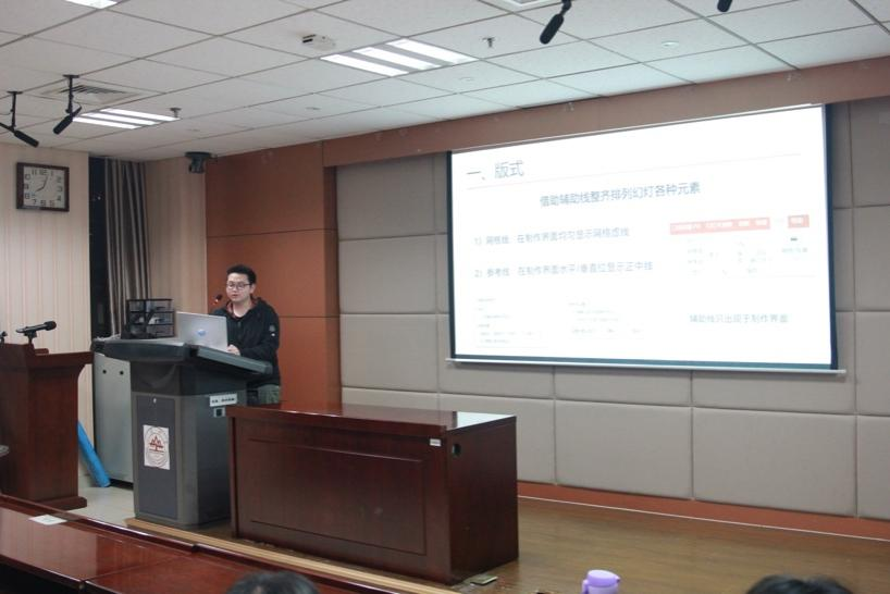 张子兴围绕版式、构图、动画、配图四个部分进行PPT技能分享。他认为首先要明确PPT在呈现提示词、理清逻辑链方面的意义,在此基础上借助辅助线排列元素以达成效果。张子兴介绍了三分法、九宫格、黄金螺旋等构图方法,向同学们演示制作直线路径动画、平滑切换及用布尔运算打造图文效果的方法。最后,张子兴分享了提升PPT技能的相关资料,以期帮助同学们更好地掌握和提升PPT制作能力。