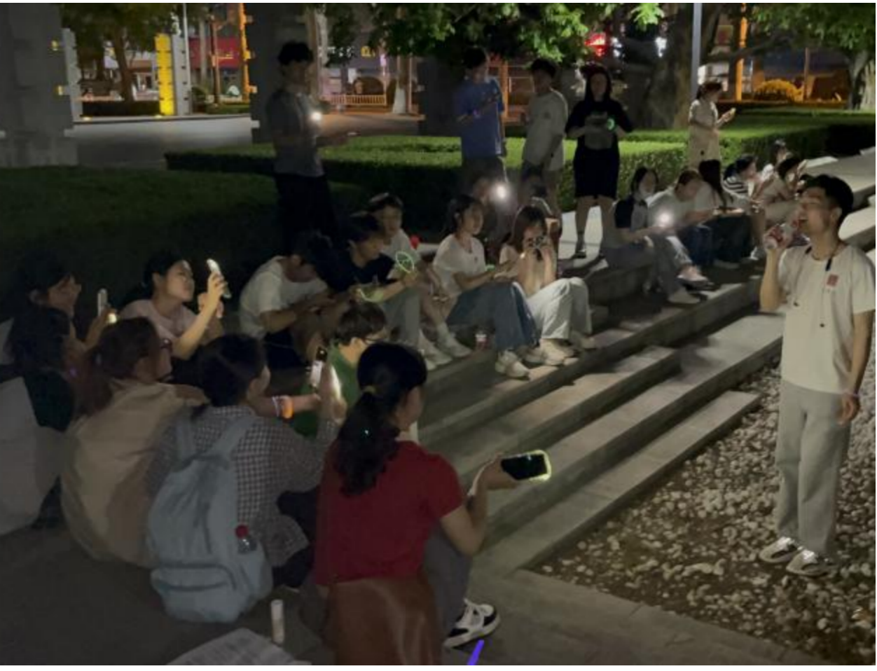 经过一番精彩的较量,白队与绿队最终打成平局。活动最后,耿铖坤、蔺华吉、谢欣奕为大家演唱歌曲《红豆》与《不值得》,同学们席地而坐,静静聆听。晚风徐徐,昏黄的灯光下人影交错,歌声、笑声、掌声随风飞向遥远的天边。在一片欢声笑语中,大家合影留念,“公司加速中”校园运动特辑活动圆满结束。