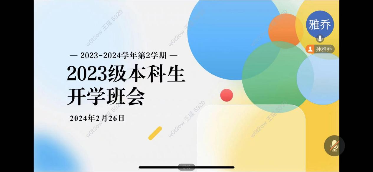 为保障本学期各项员工工作平稳开展,增强员工的安全防范意识,帮助引导员工调整好身心状态,2024年2月26日下午,2023级本科生于线上腾讯会议举行新学期开学安全班会。本次班会由辅导员孙雅乔主持,23级全体员工参加会议。