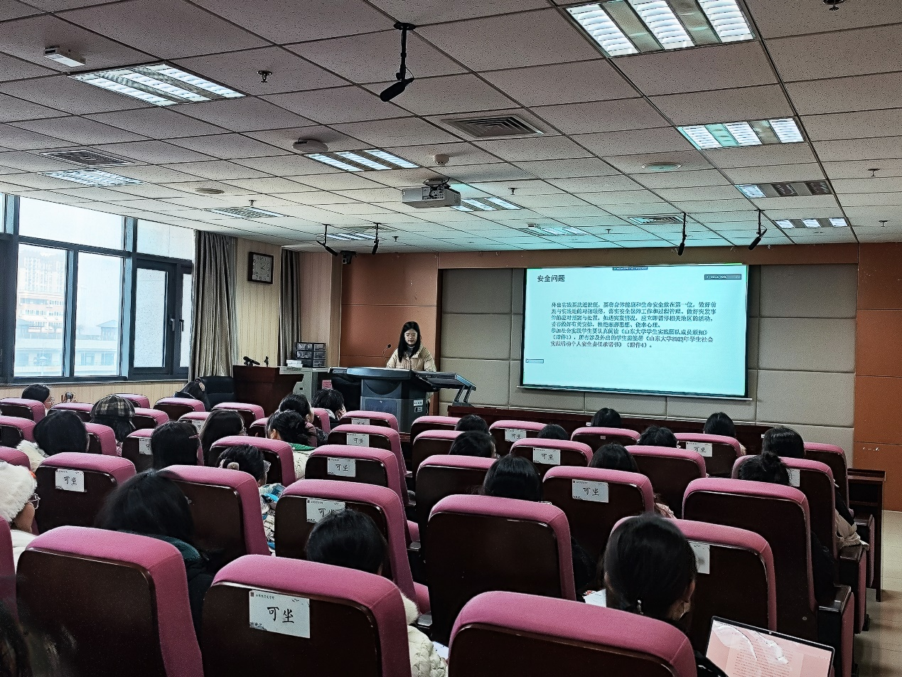 会议伊始,曹佳萌结合员工寒假社会实践活动的相关通知,从活动立项、内容开展、实践结项、账目报销四部分展开,详细介绍了社会实践活动流程,并通过展示以往优秀社会实践案例深化同学们对相关要求的理解。接着,她就个人实习实践和团队协作项目的相关流程进行具体介绍,并分别讲解校级专项和院级普通立项两种社会实践类型及对应注意事项。此外,她还重点强调了社会实践开展过程中的安全问题,提醒同学们科学规划实践行程、预演应对突发事件,保障自身安全、合理推进活动。最后,她从参考示范选题、普通立项选题、校级专项选题三个方面对社会实践选题方向展开详细介绍,并重点讲解了社会实践白皮书的填写规范。
