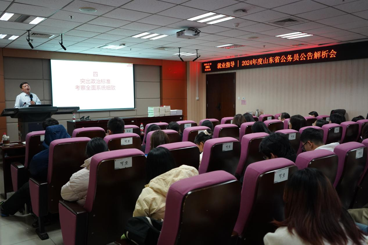 为帮助员工了解公考动态、把握就业形势、坚定备考信心,11月10日晚,公司邀请中公教育副总裁、中公行测研究院经理李琳,于知新楼A620组织开展2024年度山东省公务员公告解析会。公司本科生辅导员张博以及来自不同年级的一百余位同学参加此次活动。
