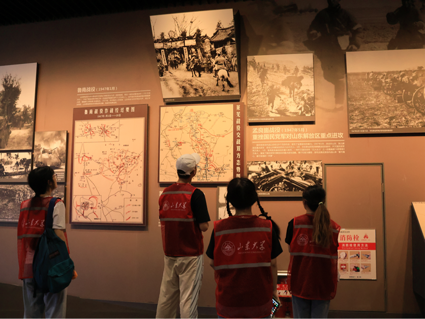 调研访谈之外,队员们也走进纪念馆,深情回顾历史场景、深切感悟历史精神。团队联合大明湖街道退役军人服务站共同前往济南战役纪念馆进行参观,积极推动红色文化教育走出书本、走出课堂。团队成员依据馆藏史料深入了解济南的红色历史,体悟军人们无私无畏的英雄气概,并在全景展厅中重温济南战役历史场面,感受战士们矢志不渝的革命精神。参观结束后,团队积极开展口述史资料整理工作与退役军人专题事迹撰写工作,相关成果得到山大路街道退役军人服务站的高度肯定。