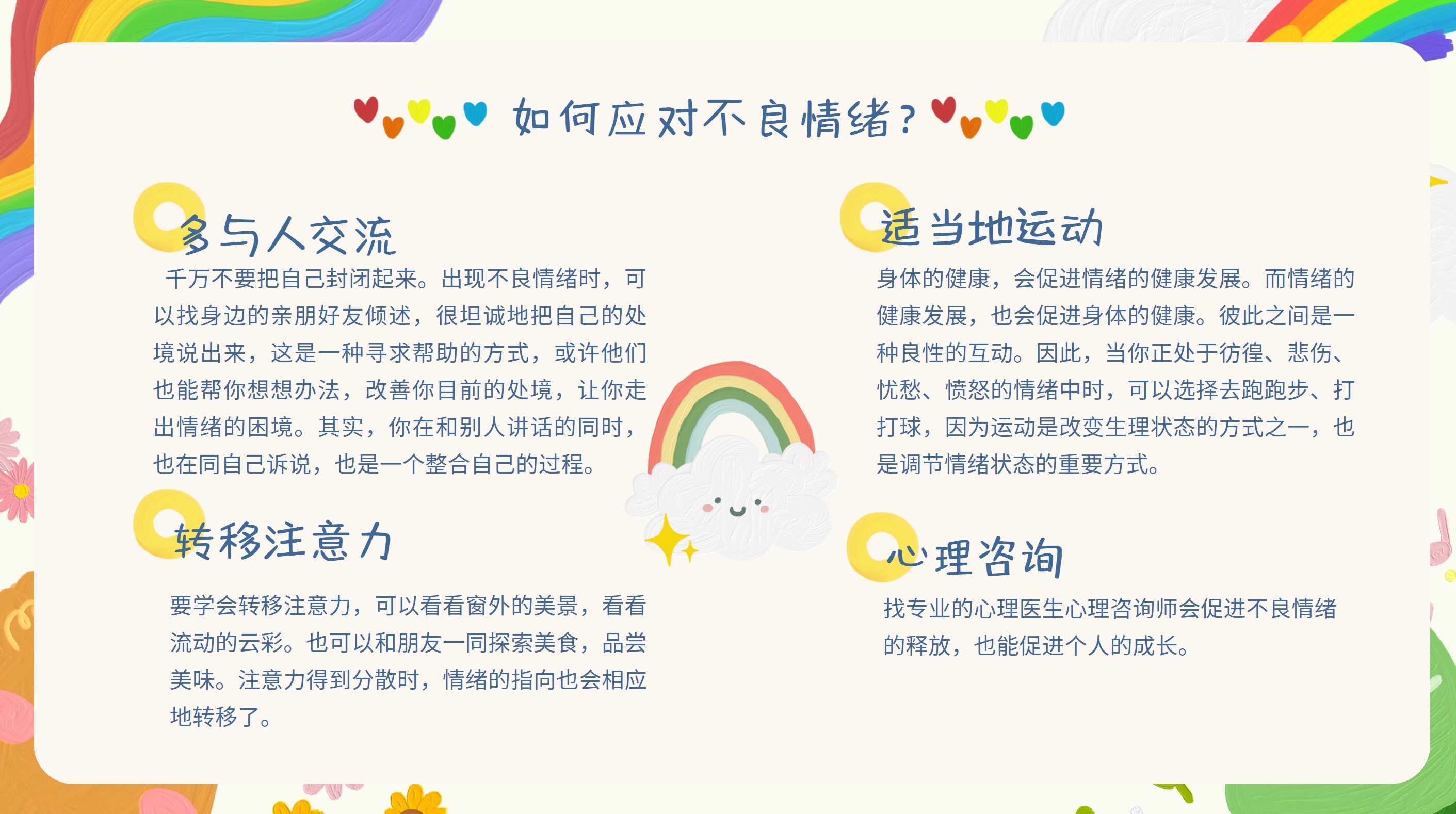 接下来,李芯同学跟大家分享了“缓解不良情绪”的相关知识,其中包括四种缓解不良情绪的方法,分别是“多与人交流” “适当运动”“转移注意力”以及“寻求心理帮助”,并跟大家讲解了分享这四种方法的依据。