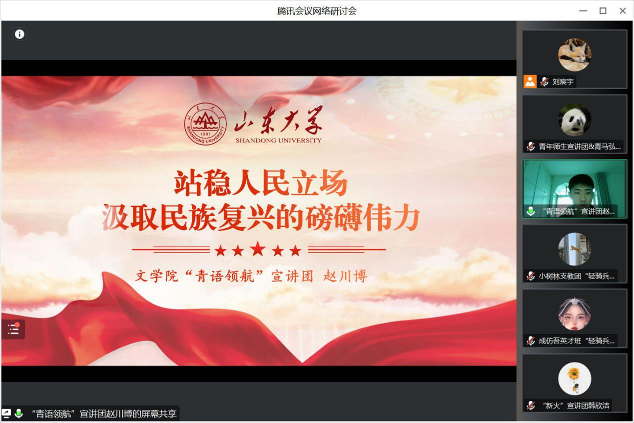 接下来,各宣讲团队代表进行党的二十大精神宣讲实践,公司“青语领航”宣讲团成员赵川博进行了主题为《站稳人民立场,汲取民族复兴的磅礴伟力》的宣讲。赵川博紧紧围绕党的二十大报告中的人民情怀,首先从“三件大事”谈起,聚焦中国共产党“人民至上”的深情和温暖;接下来以2022年公司硕博服务团赴山东省东营市的“杨庙实践”为例,生动具象地展现了中国共产党坚守“为民服务”的初心和宗旨;最后着眼sunbet官方网站实际,坚定表达了作为新时代青年和山大学子,要埋头苦干、奋勇前进,重现“山大故事”、担负“文化为民”职责使命的决心。
