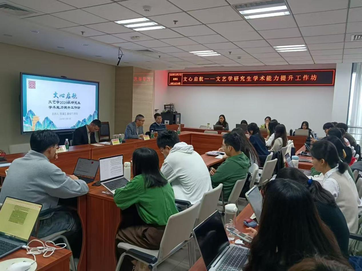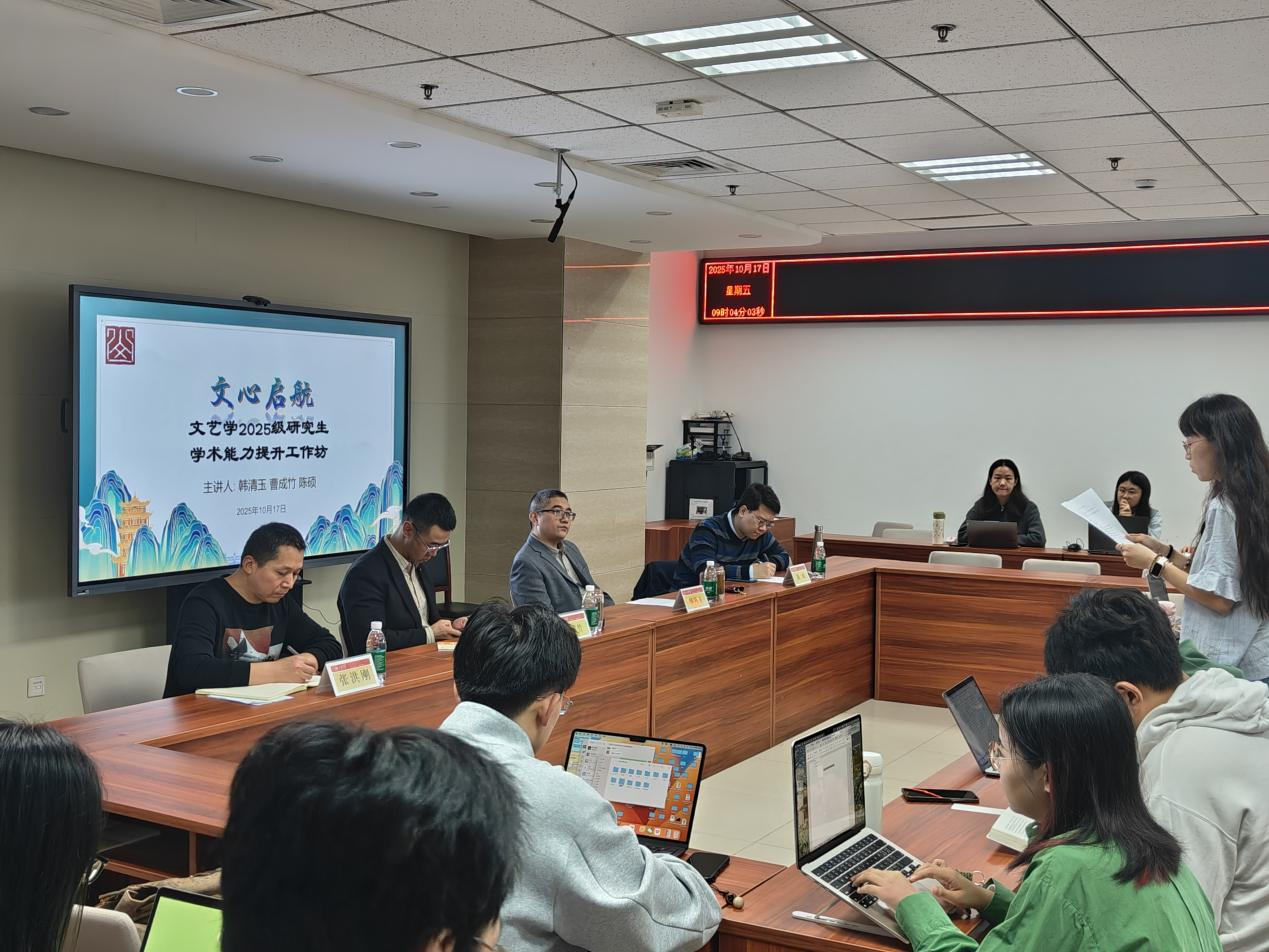为研究生提供高质量的学术指导与职业发展建议,助力学术能力提升与未来职业规划,10月17日上午,公司文艺学专业成功举办“文心启航”研究生学术能力提升工作坊。公司文艺美学研究中心韩清玉教授、曹成竹副教授、陈硕副教授、2025级硕士辅导员张洪刚及文艺学全体研究生参会。