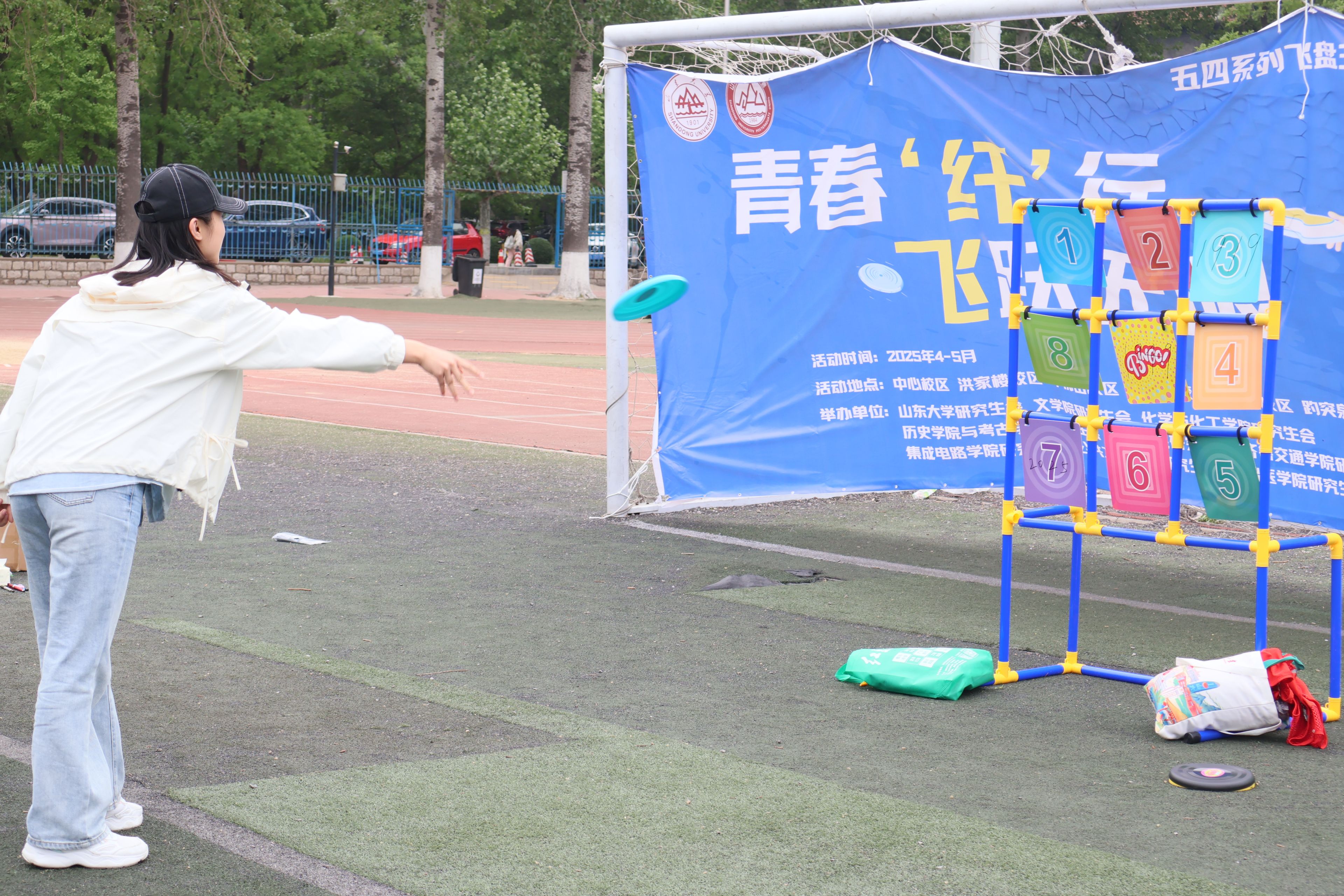 在“飞跃未来・掷热血”环节中,现场架设的九宫格飞盘支架标注着“奋斗正当时““百年征程”等标靶,同学们手持飞盘,全神贯注地瞄准,在1分钟内努力击中标靶。随着一次次飞盘命中标靶,现场掌声欢呼声不断,展现了山大青年矢志奋斗、勇于争先的青春风采。