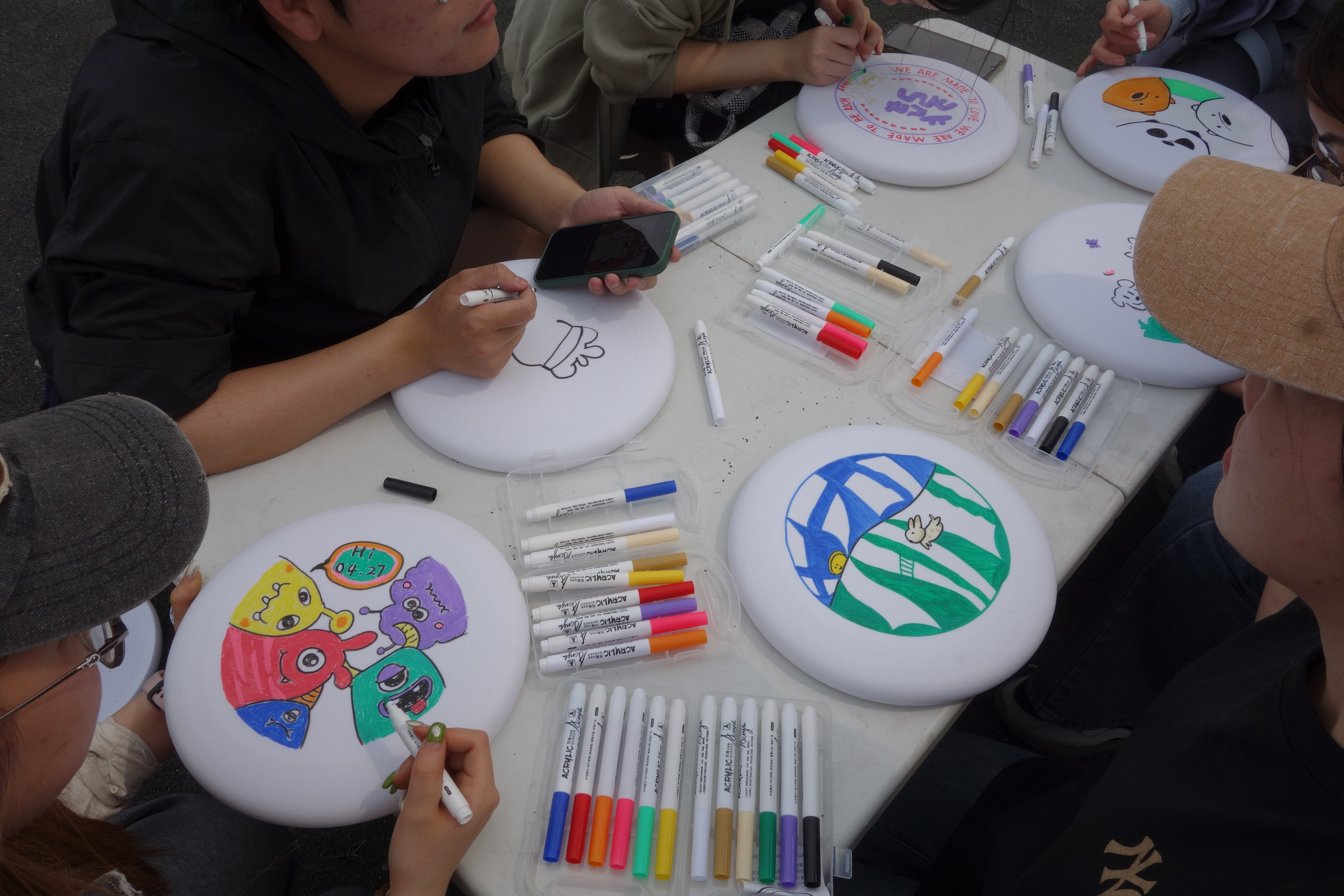 教学环节结束后,备受期待的三个创意玩法同步开展。在“飞盘涂鸦・绘青春”区域,同学们2-4人由组队,领取飞盘和环保颜料后,大家充分发挥奇思妙想,将各种色彩与图案绘制在飞盘上。同学们手持自己设计的飞盘互相切磋交流,现场气氛热烈非凡。