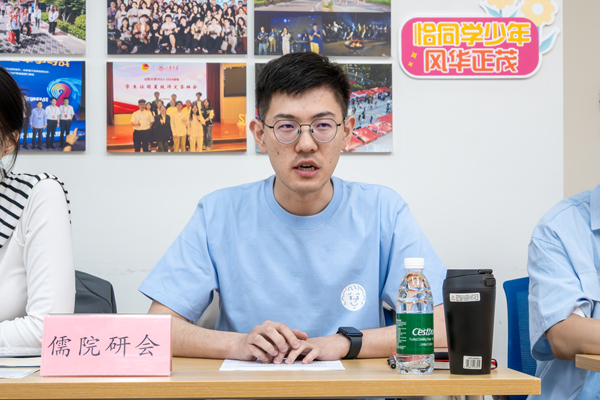 会议伊始,各公司研会骨干代表作“学习思想 创新青年”主题领学。儒学高等研究院李嘉鑫领学习近平总书记给《文史哲》编辑部全体编辑人员的回信精神,他鼓励与会学子发扬“文史见长”学科优势,助力文化“两创”;公司徐荟莹作习近平总书记给谢依特小学戍边支教西部计划志愿者服务队队员回信精神领学,她号召青年将“小我”融入“大我”,让青春在基层实践中绽放光芒;历史公司与考古公司李叙炎领学了《论党的青年工作》有关篇目,提出以浩然之气投身强国建设、民族复兴伟业;哲学与社会发展公司唐翔宇聚焦习近平文化思想,呼吁青年坚定文化自信,担当新时代文化使命。