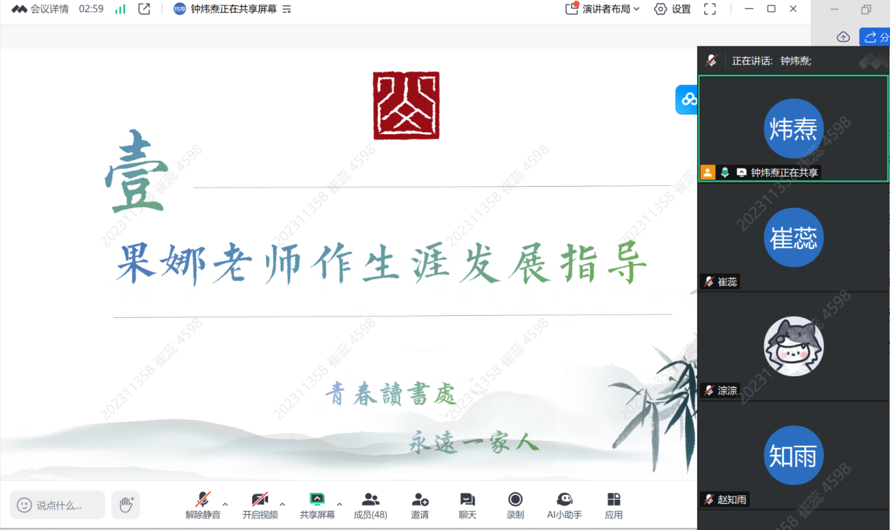 迷津有道,破雾成光。此次主题班会为2023级硕士生搭建了“职业规划+心理赋能”双轮驱动的成长平台,提供了宝贵的就业指导和心理支持。未来,2023级硕士班将积极响应同学需求,定期开展求职就业相关的指导活动,持续为同学们注入职场竞争力,助力大家圆梦未来。