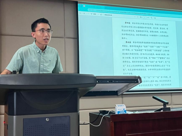张嘉旭讲解了《sunbet研究生综合评价细则》和《sunbet研究生奖学金评审办法》。他逐条介绍了两份文件条例,重点强调了综合评价的考核内容、科研成果评分细则和研究生奖学金测评内容,并细心解答了同学们关注的共性问题。