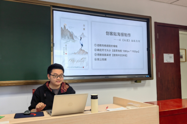 注重风采呈现,锤炼新媒体本领。新媒体中心部长孙千涵、张子兴、吴晨曦为大家进行了新媒体运营技能培训。孙千涵向大家介绍了推文排版的相关软件及其使用技巧,并结合自身经验演示了如何利用秀米丰富的组件库、灵活的图集功能以及强大的SVG动画效果,制作出精美有新意的推文。张子兴聚焦于海报设计的主题,通过生动具体的案例介绍了使用创客贴和PPT进行海报制作的技巧并现场演示了操作过程。吴晨曦深入浅出地介绍了Photoshop软件界面中的常用面板及其功能,鼓励大家通过灵活选择不同的操作方法有效提高编辑效率。互动环节中,同学们就公文写作公众号运营、海报设计等提出问题,新媒体中心部长一一耐心解答,反响热烈。