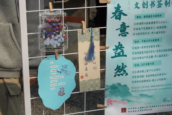 “春意盎然”文创书签展台人头攒动,洋溢着青春跃动的气息。在志愿者的耐心指导下,师生们充分发挥艺术创意,亲手制作成一幅幅别具匠心的微型春景。