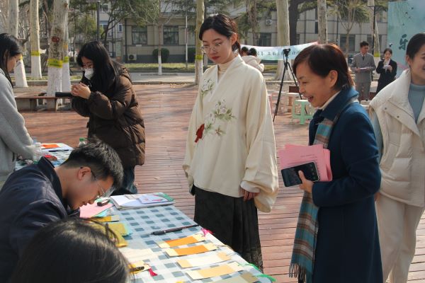 在“楹联溢趣”趣味对联展台,师生们围绕“红绽寒梅香沁字”“莺歌北渚催诗笔”两副上联展开即兴创作,“绿催新柳色沾巾”“燕舞南天引月笛”等诸多下联纷纷涌现。中国古代文学专业教师乐进进还从平仄、对仗、意蕴等角度进行了现场点评,与师生一起品味联对文化的独特风华。
