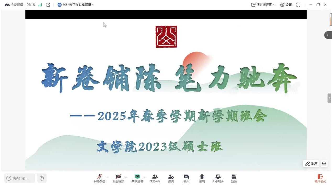为切实做好新学期服务保障工作,大力弘扬沂蒙精神,理解领会总体国家安全观,帮助同学们进一步坚定理想信念,明确生涯方向,筹谋个人发展,公司2023级硕士班于2025年3月12日召开“新卷铺陈,笔力驰奔”主题班会。2023级硕士班辅导员果娜受邀参与会议,2023级硕士班全体成员与会。本次会议由2023级硕士班班长钟炜焘主持。