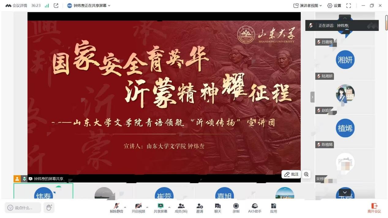 最后,钟炜焘作主题宣讲。他立足齐鲁深厚文化积淀,通过古今文本对照的方式,解析儒家治国理念与总体国家安全观的契合度,援引沂蒙革命历史中涌现出的可敬的军民事例,深入解读沂蒙精神基本内涵。鼓励同学们贯彻总书记视察山东时作出的“大力弘扬沂蒙精神,让红色基因代代相传”指示精神,奋力谱写为中国式现代化挺膺担当的青春篇章。