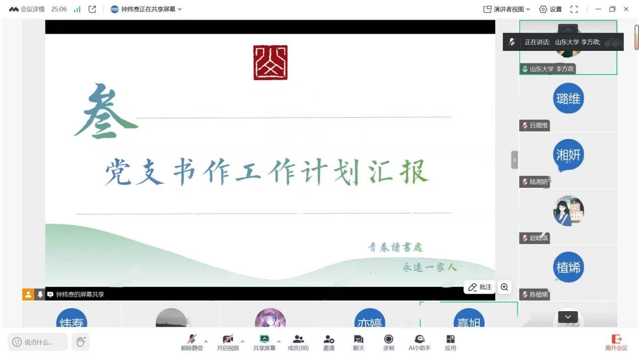 接着,硕士第三党支部书记崔蕊与硕士第六党支部书记李方政作新学期工作计划汇报。崔蕊回顾了第三党支部上一年度主要工作,汇报了支部组织管理、亮点活动等成效,并指出将联合多组织策划联动活动;李方政报告了支部成员变动情况,介绍了新学期读书会策划情况,表示将坚持落实“三会一课”制度,推进理论学习日常化、常态化。