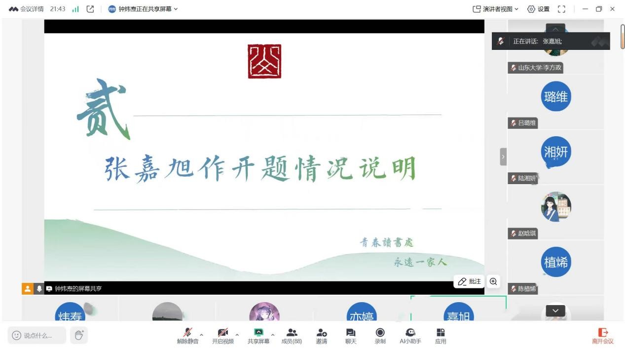 随后,学习委员张嘉旭就开题情况展开说明。他全面汇报并深入分析了各专业开题现状,讲解开题答辩所需材料的填写要点,分享了准备内容与答辩技巧,着重强调同学们应与导师保持密切沟通,及时调整题目与论文进度。