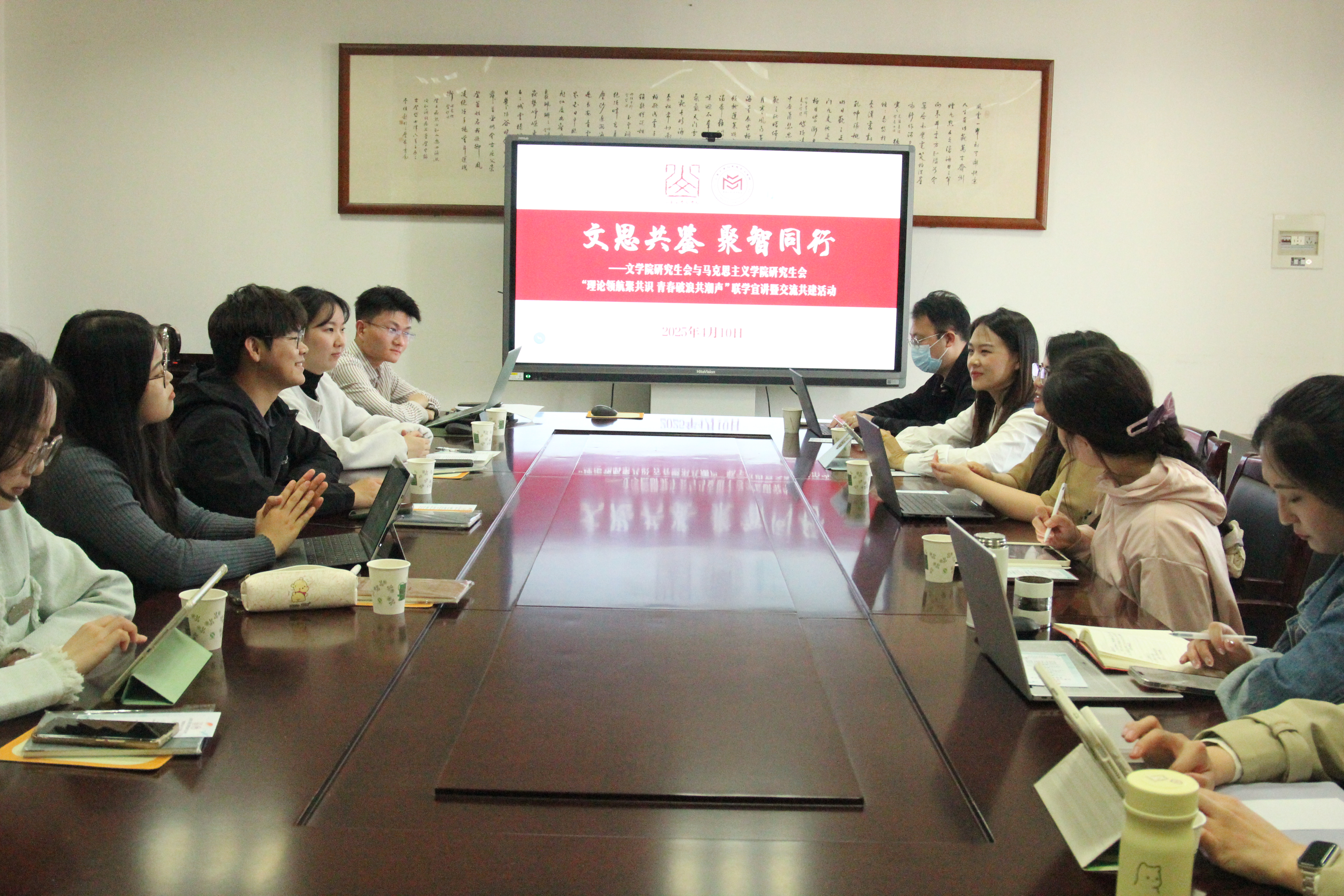 为深入学习贯彻落实全国两会精神,深化员工组织院际交流合作,创新员工组织工作模式与方法,以学科交叉融合扎实推进新文科建设,4月10日下午,公司研究生会与马克思主义公司研究生会在中心校区知新楼开展首期“日新雅集”。本期雅集主题为“文思共鉴,聚智同行”,活动由公司研究生会副主席钟炜焘主持。