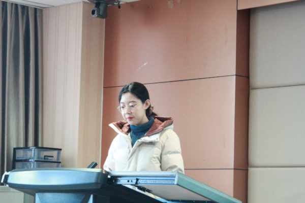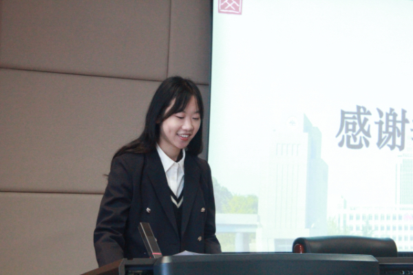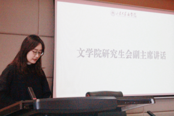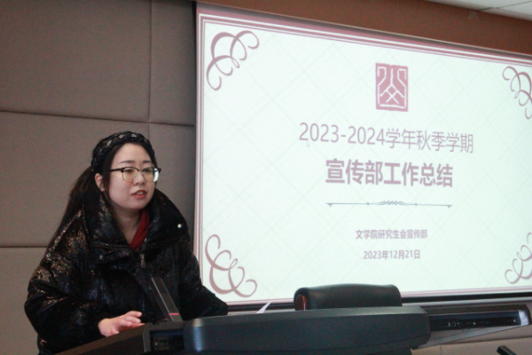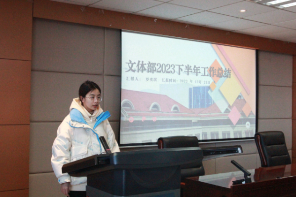 随后,研会副主席宋文婷、韩蔚然分别就本学期分管部门的工作情况进行发言。宋文婷承接短片学习环节,联系办公室、宣传部、新媒体中心三个部门的具体工作,强调继续做好宣传工作,号召同学们共同塑造公司形象,用喜闻乐见的语言和形式讲好青年故事,承担文化使命。韩蔚然从内部建设和外部交流两方面,高度评价了文体部、实践部、学术部过去一学期的工作成果,以平实恳切的语言,对研会指导老师及全体研会成员的辛勤付出表示感谢。