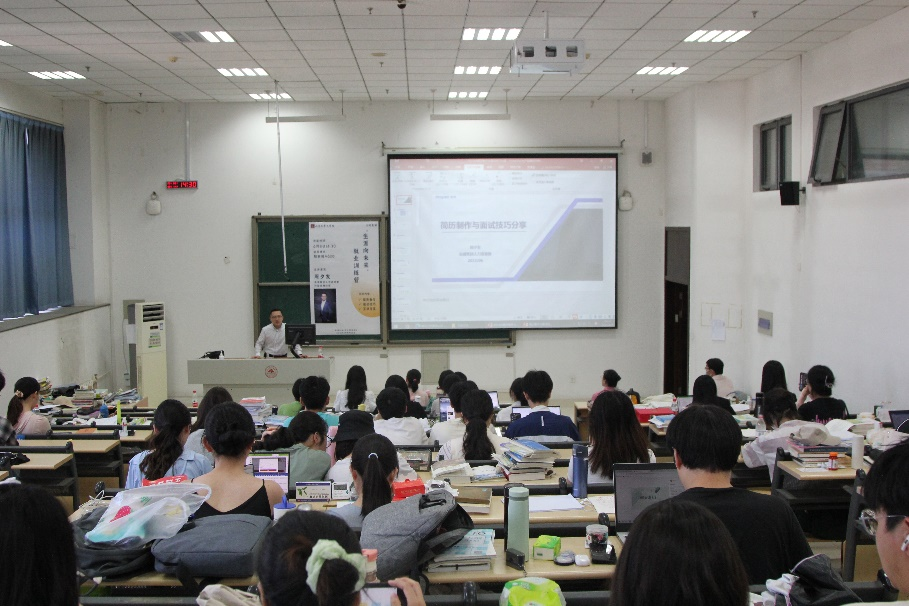 周夕发从简历制作和面试技巧两个方面为同学们提供了就业信息与指导。他结合个人从事人力资源管理工作的经历,强调简历在求职过程中的重要性,从个人信息、教育经历、校内实践、校外实习四个部分详细讲解了简历的组成要素。周夕发以往届收到的员工简历为例,具体分析每份样本的优缺点,与同学们展开互动,表示要坚持真实美观、主次分明、规范简洁的基本原则,根据自身情况撰写简历,扬长避短,以书面形式展示个人风采。