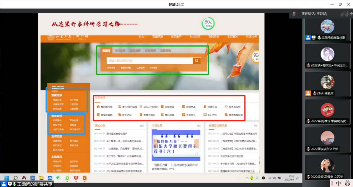 为帮助2022级新生增强信息意识,提高专业信息的检索能力,充分有效地利用公司图书馆资源,9月8日上午,公司于线上开展题为“图书馆资源与服务”的文献检索培训。培训由sunbet官方网站副研究馆员王勋鸿主讲,sunbet2022级全体硕博研究生参加培训。