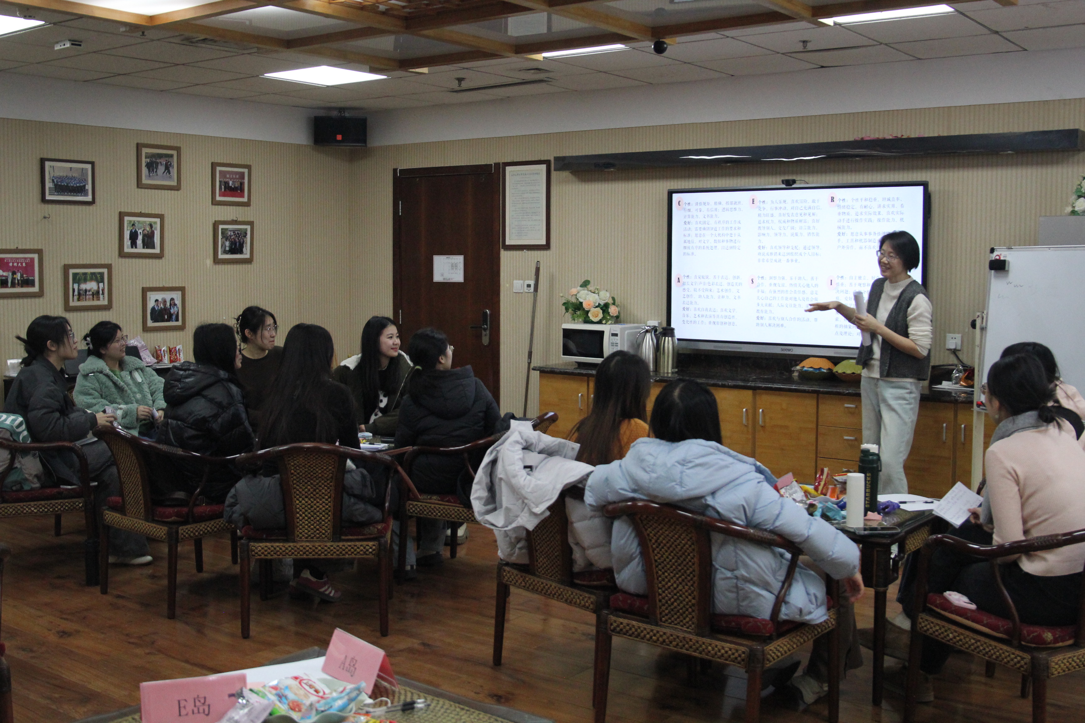 在热烈欢快的讨论与点评氛围中,本次活动接近尾声。果娜邀请大家在活动后进行头脑风暴,立足国家发展国情,结合自身专业背景,深入思考个人理想的职业环境、意向行业及目标岗位,为个人的未来发展做好准备。她着重提醒,兴趣与人格分类存在局限性,切忌给自己贴固定“标签”,更不能将普通兴趣等同于职业志趣,要以辩证思维看待生涯模型,坚持多元选择。