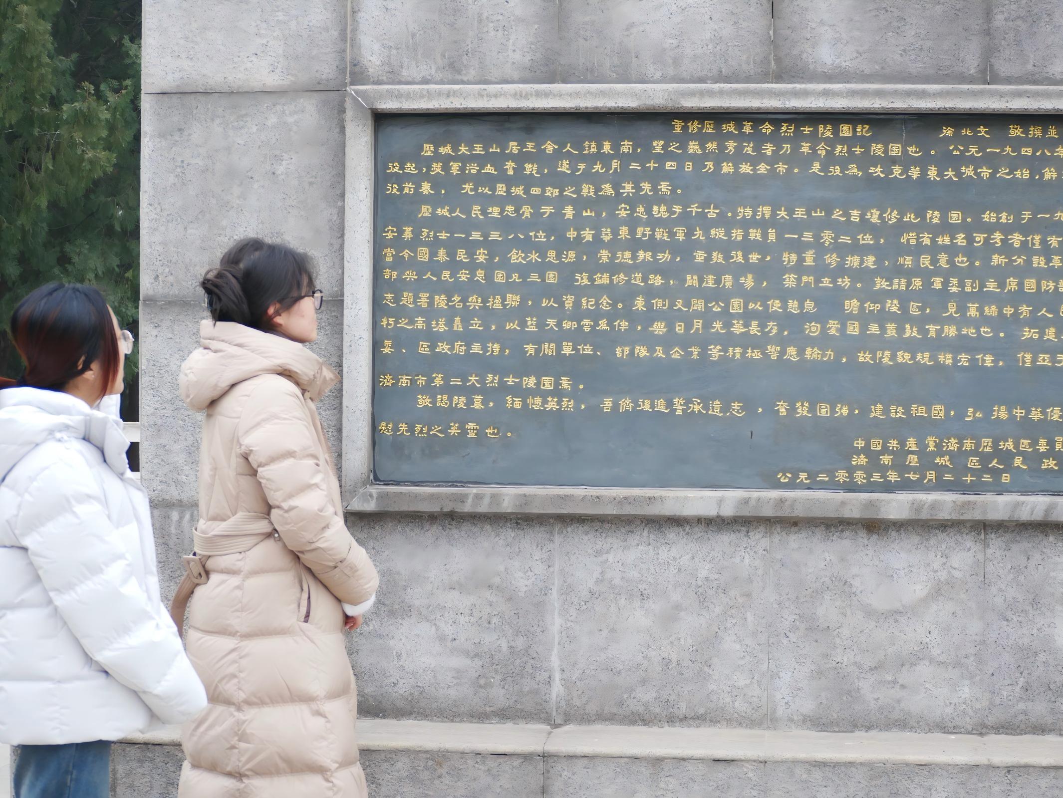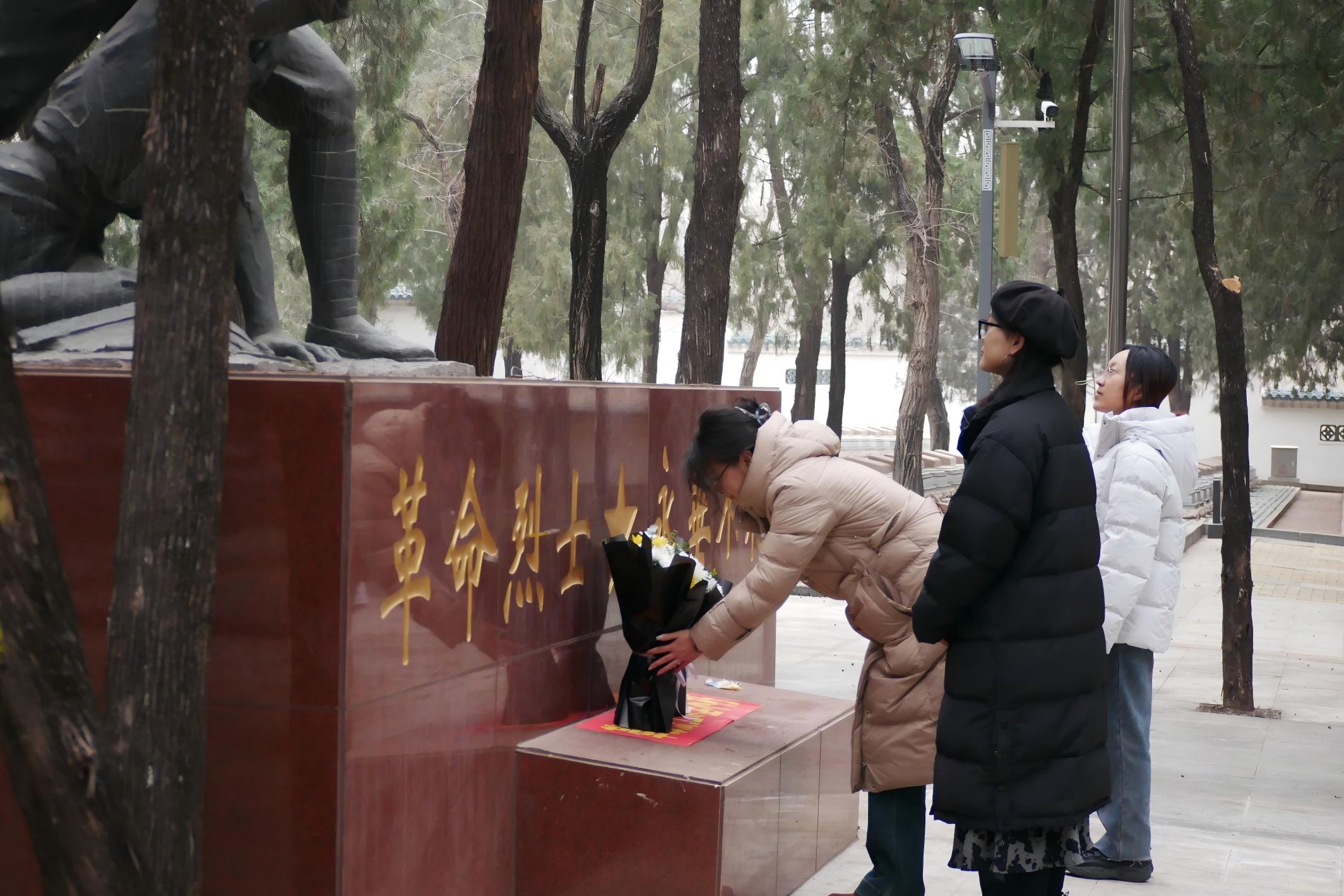 1月31日,团队抵达历城革命烈士陵园后,首先前往革命纪念碑前肃立致敬。巍峨的纪念碑镌刻着英烈们为国家独立、民族解放挺身而出的忠魂与担当,承载着中华民族不屈不挠的精神内核。团队成员驻足凝视、追忆英烈壮举。在革命烈士雕像前,团队举行了一场庄重肃穆的献花仪式。团队成员依次上前鞠躬致敬,此举不仅是对英烈的深切哀思,更是一场跨越时空的精神对话——感悟他们坚定的理想信念、忠诚的家国情怀、无畏的牺牲精神,深刻体会当下来之不易的和平生活,进一步明晰自身传承革命精神、守护家国安宁的责任与担当。在讲解员的引导下,团队成员认真学习了园内展板内容,从文字与影像中重温革命先烈的英勇事迹和历城地区革命斗争历史。向先烈们的崇高品格致敬的同时,团队成员也深刻体会到济南战役的胜利既离不开革命先烈的浴血奋战,更得益于济南人民群众的倾力支援与无私奉献。群众筹粮支前、同心抗敌,凝聚起军民一心的磅礴力量,彰显了革命精神的重要底色。