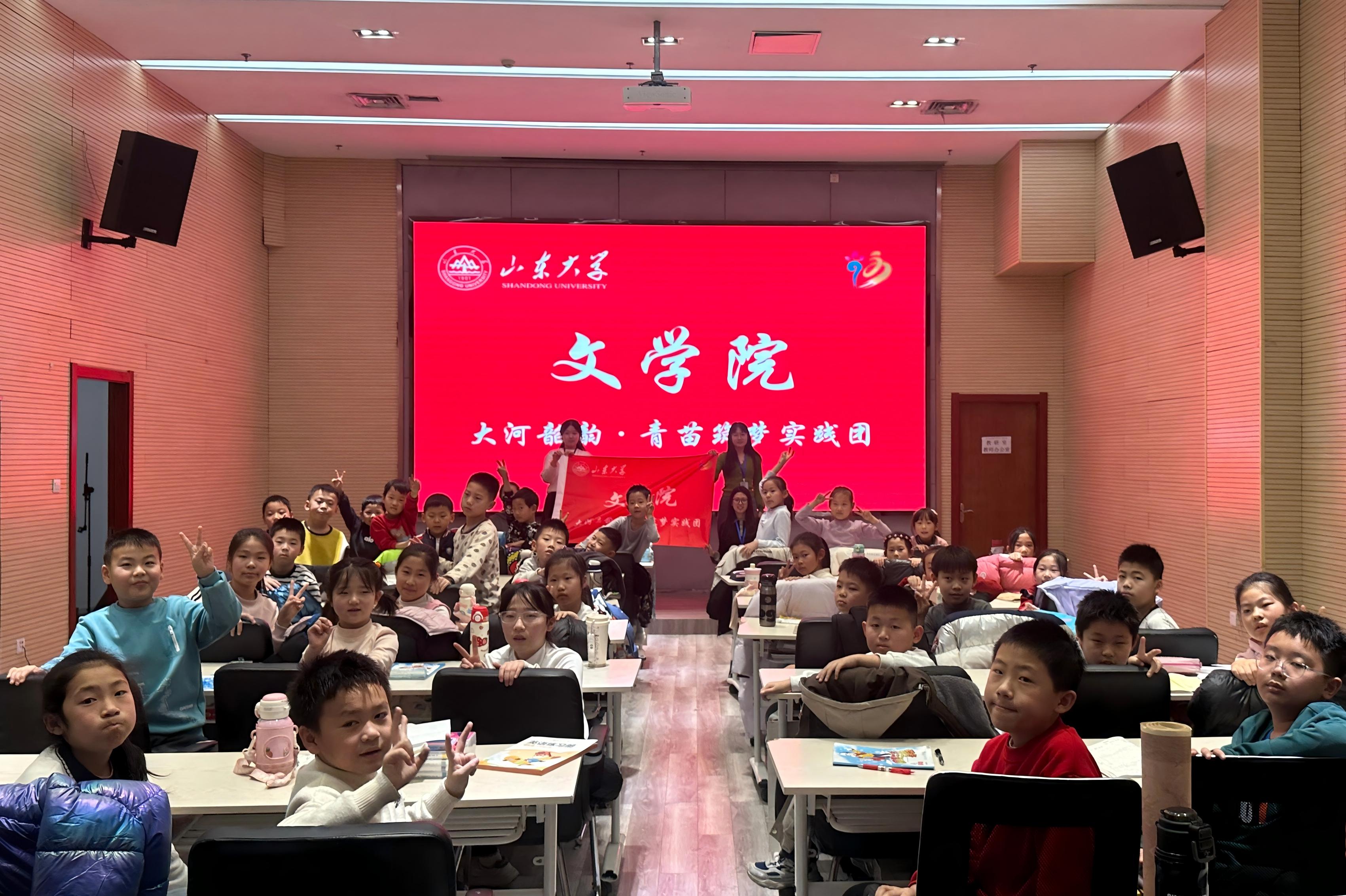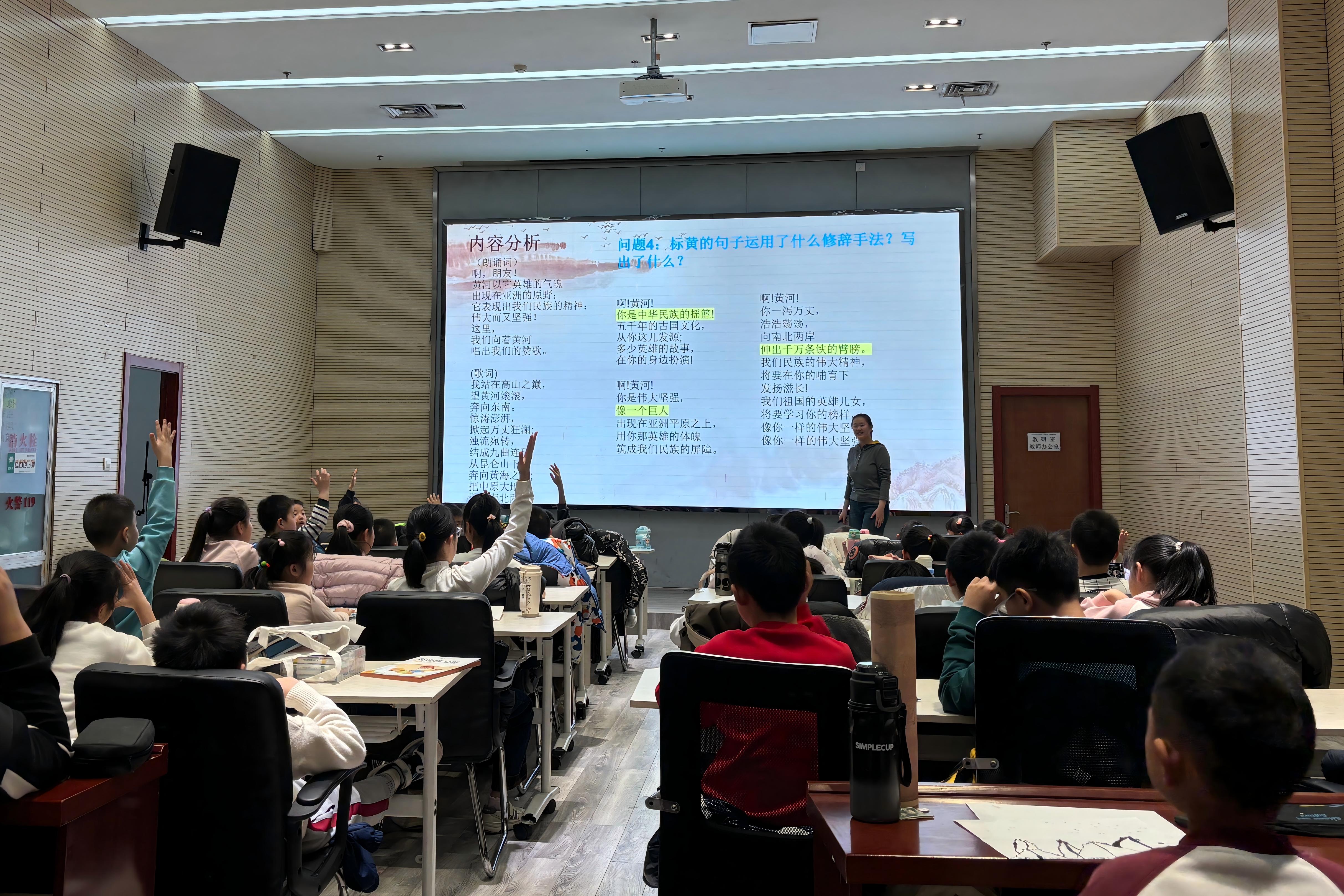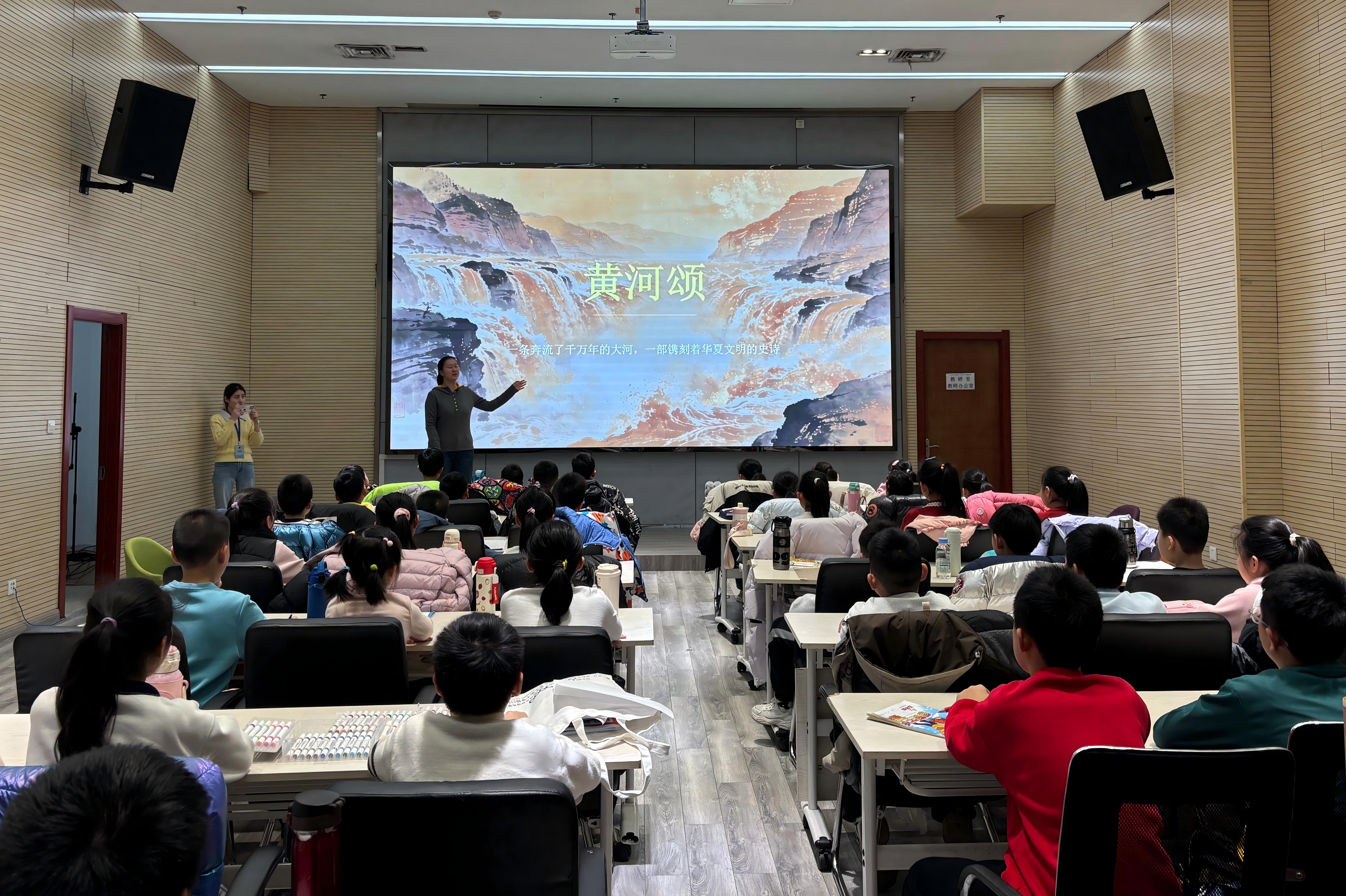 宣讲过程中,孩子们全神贯注、满怀好奇。团队成员结合济阳黄河文化历史文脉,深入解读《黄河颂》的精神内涵与时代价值,从“惊涛澎湃”的壮阔意象到“浊流宛转”的坚韧姿态,从“伸出千万条铁的臂膀”象征的民族力量,到“筑成我们民族的屏障”承载的家国情怀,逐一拆解诗句背后的深意,逐步引导孩子们理解黄河精神与中华民族自强不息、百折不挠品格的内在关联。问答环节,孩子们积极举手、踊跃回答,课堂氛围浓厚。宣讲尾声,团队成员带领孩子们高声齐读《黄河颂》,齐颂《黄河大合唱》,在诗行和词曲间感知黄河的磅礴气势。
