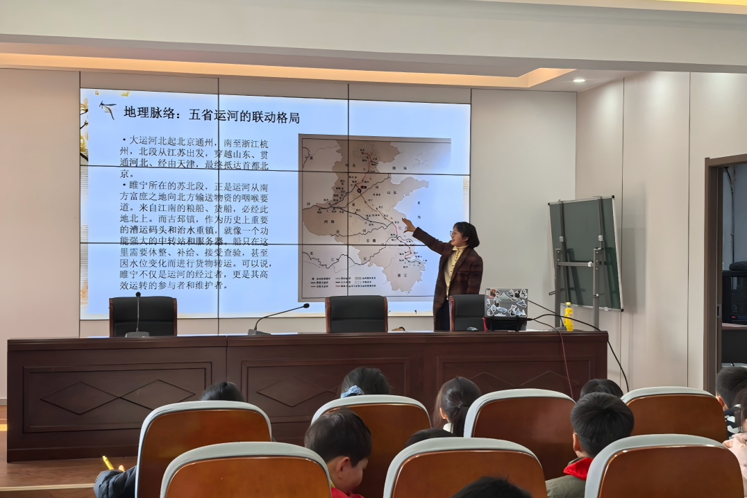 活动伊始,团队成员以“家乡的大运河”为切入点,用通俗易懂的语言梳理了大运河2500多年的发展脉络,详细解读了运河“人工开凿、贯通水域”的本质特征与漕运核心功能。结合睢宁地域特色,团队重点介绍了古邳镇下邳故城遗址等运河遗存,阐释了睢宁作为南北水运通道重要节点的历史地位,让孩子们了解到家乡与运河深厚的历史渊源。