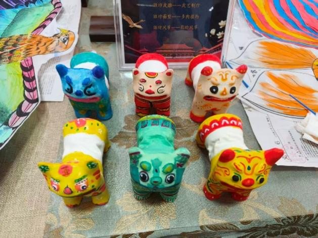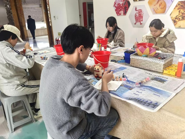 活动伊始,团队成员前往潍坊民俗博物馆进行参观学习。在馆内工作人员的带领下,队员们依次浏览了风俗、中堂、节气习俗及工艺展区,详细了解了老潍县的婚嫁习俗、城市建设变迁以及高密三绝等特色工艺。在非遗体验环节,团队成员在专业老师的辅导下,重点体验了国家级非遗泥叫虎的彩绘技艺。队员们手执画笔,仔细勾勒泥叫虎的眉眼与斑纹,在这一“塑、绘”结合的过程中,切身感受到了传统民俗工艺中蕴含的独特匠心与艺术审美。