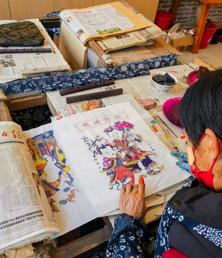 离开十笏园,团队成员奔赴杨家埠民间艺术大观园,并拜访了国家级非遗传承人杨乃东。在工作室中,杨乃东向队员们展示了“杨家埠木版年画”的制作细节,他语重心长地告诉队员们,年画就是年的象征,年画不仅是节日的装饰品,更是反映中国民间社会生活的百科全书。通过与传承人的面对面交流,队员们不仅了解了年画背后的文化蕴义,更深刻领悟到了老一辈手艺人的工匠精神。在杨家埠大观园,队员们亲手体验了印制环节,大家手握棕刷,小心翼翼地完成上墨、铺纸、拓印等工序,随着纸张揭起,线条粗犷、色彩饱满的年画跃然纸上。这让队员们直观地触摸到了木版年画的活态历史,切身体会到了每一道工序背后所承载的文化厚度。